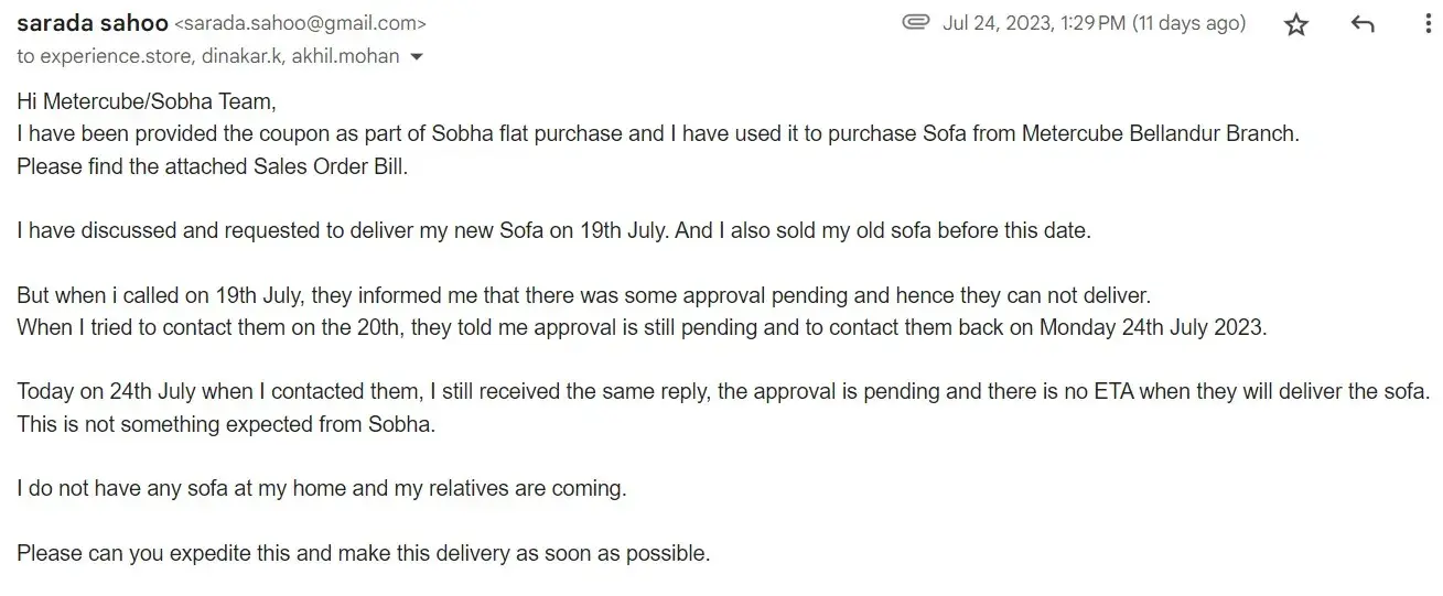 Not delivered sofa purchased from Metercube (Sobha Ltd)