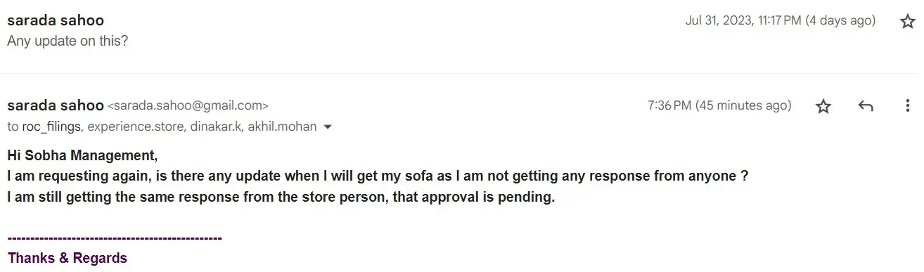 Hello, I purchased a Sofa Set in March using voucher and paid remaining amount using Cash. I was not getting any call for delivery and then I called them and confirmed deliver date as 19th July 2023, and when it is not deleivered on 19th July I called them. After that I got to know all false statements which I never heard earlier even while confirming the delivery date. Now they are not telling me when they will deliver and when I ask them they keep telling me false things that they have sent some approval request and it is pending and once approved they will deliver but they can not tell when they will deliver. I have to file consumer case, it is kind of a false trap and false promise, It is our money and they have received but Product not delivered as per promise. Please help me to file a consumer case. I am attaching all the proofs. I also have the recordings of call, unable to attach audio file, if needed I can share.