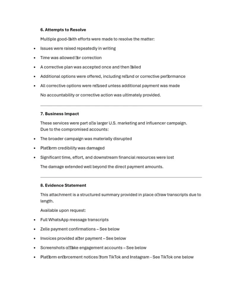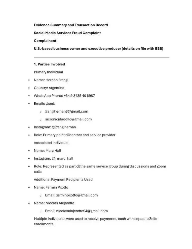 I am reporting an international service fraud involving misrepresented social media marketing services. I hired an individual and associated parties operating under the names Hernán Frangi, Marc Hall, and Sicronicidad LLC to provide professional social media marketing services for my business. The services were marketed as legitimate, organic engagement...