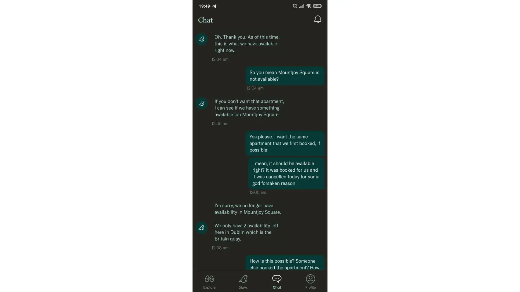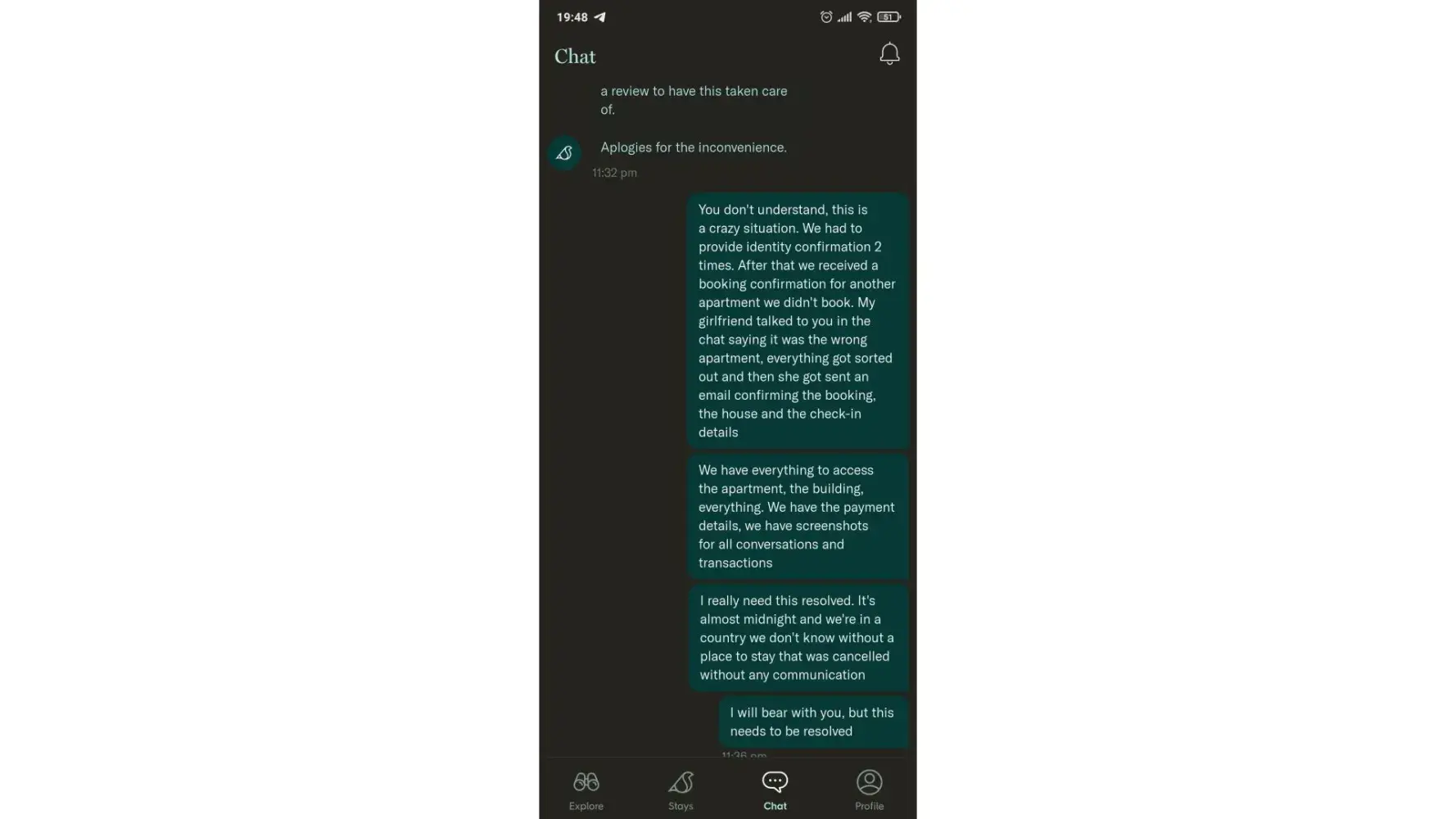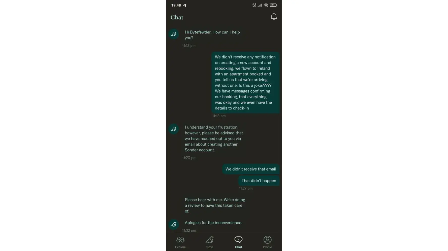 I started complaining. The key fact about this whole situation was that we DID NOT receive any email letting us know what had happened. I mentioned this in the chat, which I was told it was a mistake from their side. Basically, they cancelled our booking, our accounts, and didn't notify us of this happening. Had we not opened the application before our flight and we would've only learned the situation when trying to access the apartment.