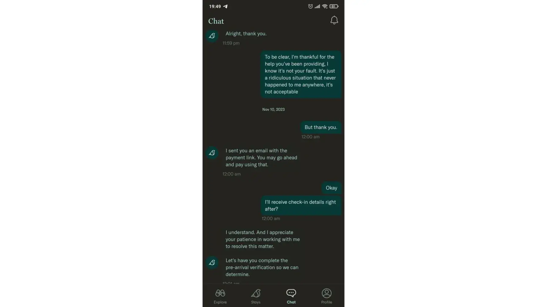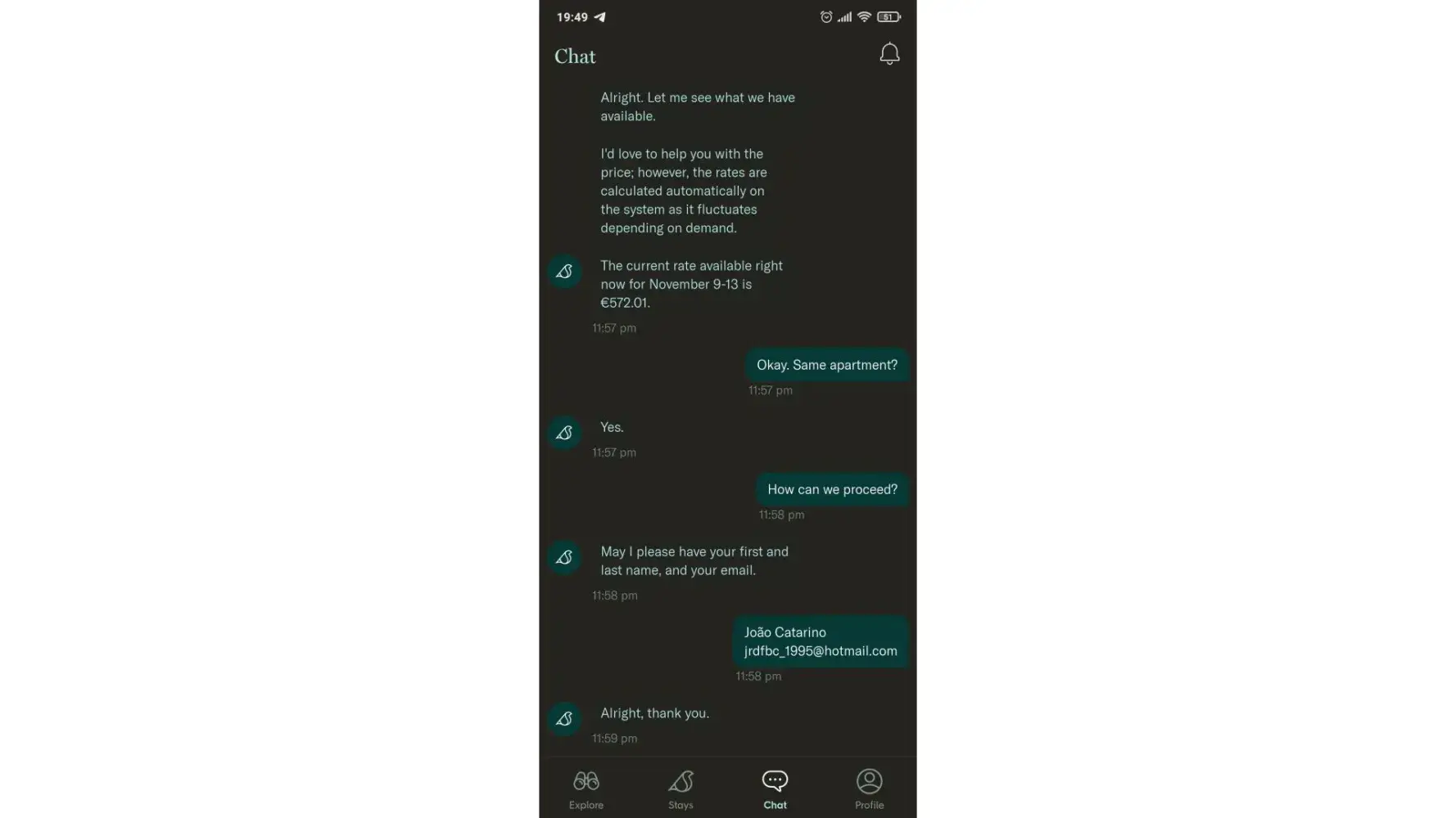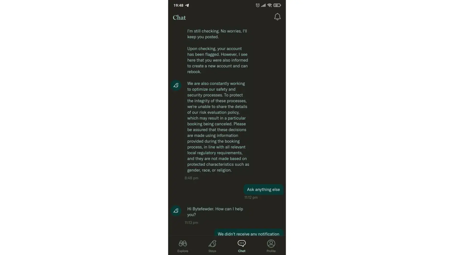 I started complaining. The key fact about this whole situation was that we DID NOT receive any email letting us know what had happened. I mentioned this in the chat, which I was told it was a mistake from their side. Basically, they cancelled our booking, our accounts, and didn't notify us of this happening. Had we not opened the application before our flight and we would've only learned the situation when trying to access the apartment.