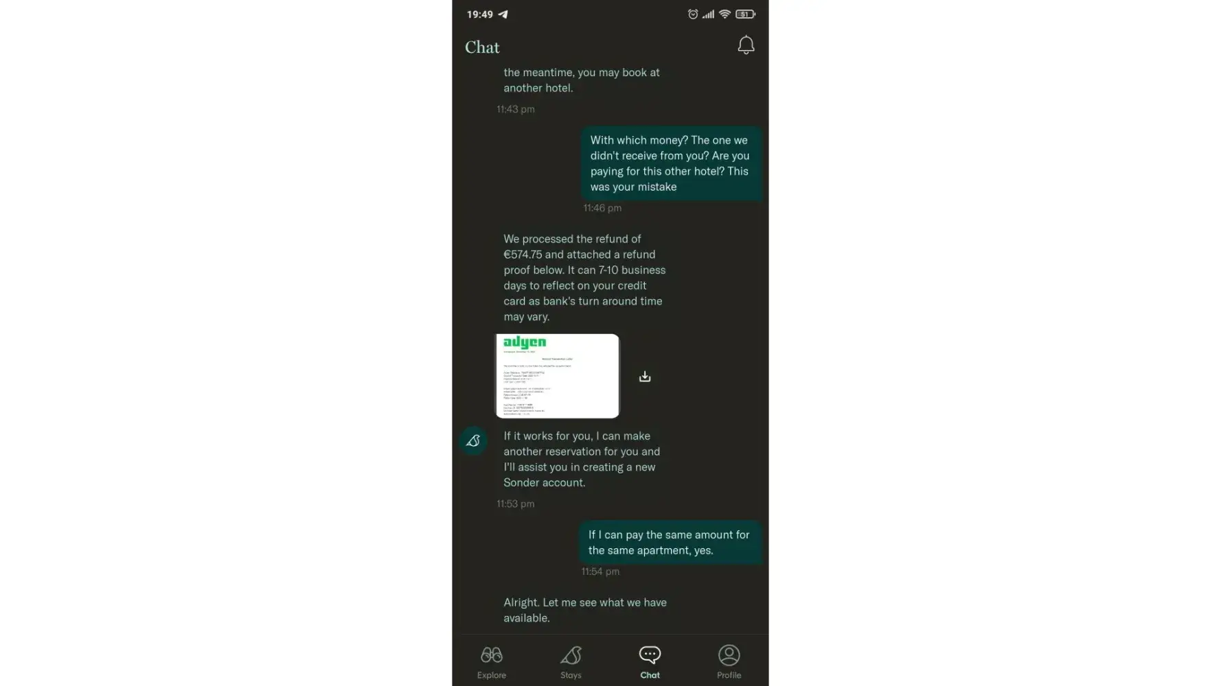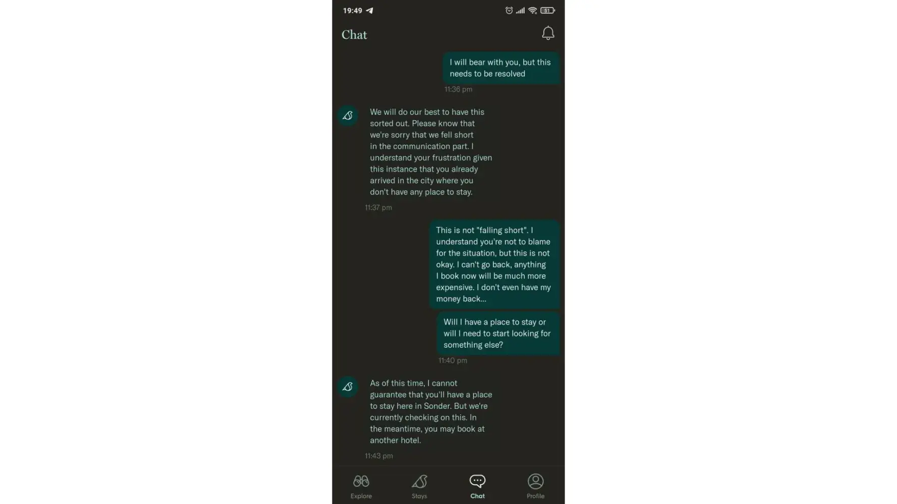 It's fair to say we didn't want to have to deal with Sonder again. At almost 1 am, we had to look for another place to stay, near the first apartment, and we ended up having to stay at an hotel which was more expensive. Fortunately we had a way to pay this hotel, but imagine we didn't, imagine we only had the money we used at first to book with Sonder. We weren't getting this money any time soon. How were we going to get a place to stay without the refund money? What would we do? This would be a nightmare for some people.