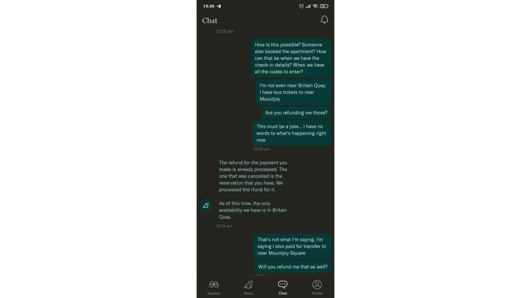 I still believed we could get our apartment back, I still believed that all of the incompetence so far could be turned around. We already had booked travel for "Mountjoy Square", and we started going on its direction, but upon arriving and after a lot of back and forth in the Chat with customer support, which you can read in the attachments, we were basically told they couldn't do anything and that our booking was fully cancelled. They told us a refund was sent (they sent us proof in the Chat, in which we saw that the refund was only sent on the exact same day, November 9th) and it would take 7-10 business days to be done and that the apartment we wanted was no longer available. They could only help us book a new apartment, which he had to pay again, even though we hadn't received the refund yet. Surprise surprise, the only apartment available was "Britain Quay", the apartment my girlfriend received confirmation for, supposedly by mistake. This was basically the last straw. The apartment was the same price as the one we booked, but it was super far away from the place we wanted to stay and they wouldn't neither reimburse the travel to the first apartment nor help us get to the new apartment.