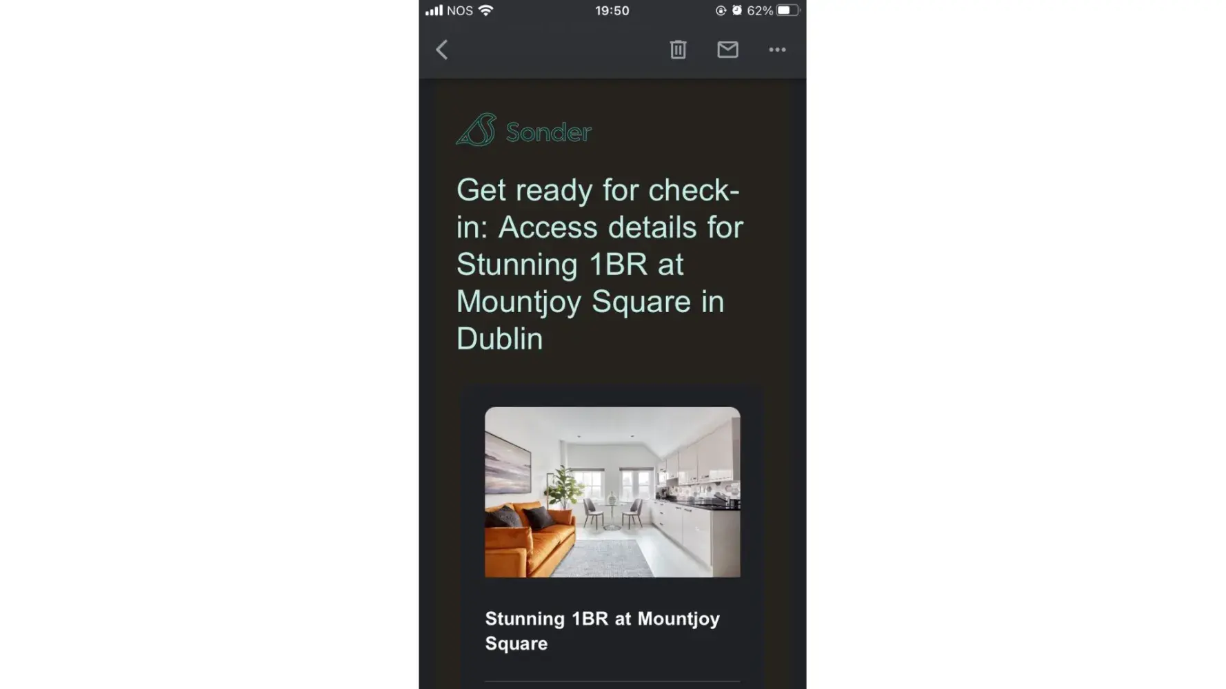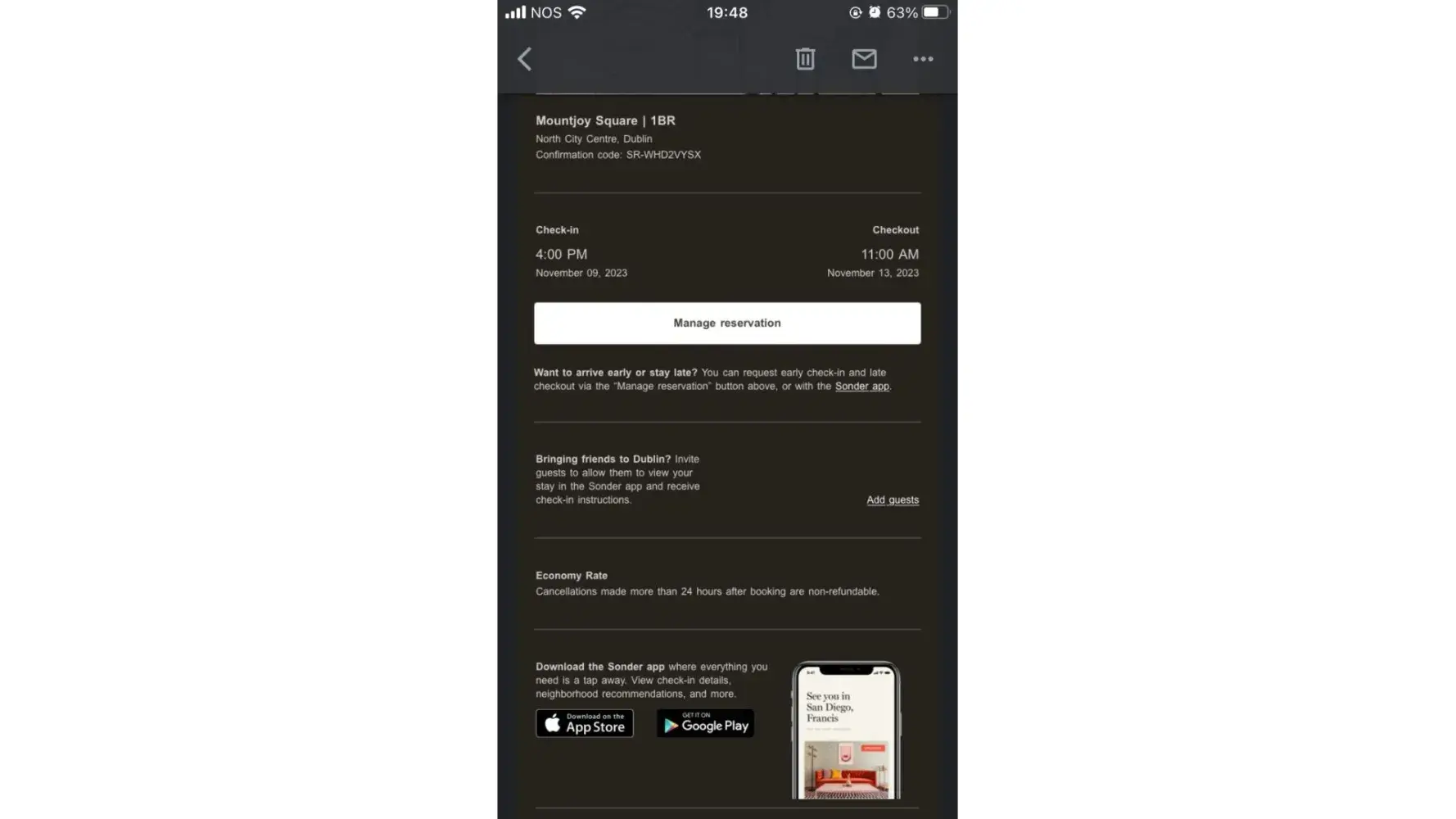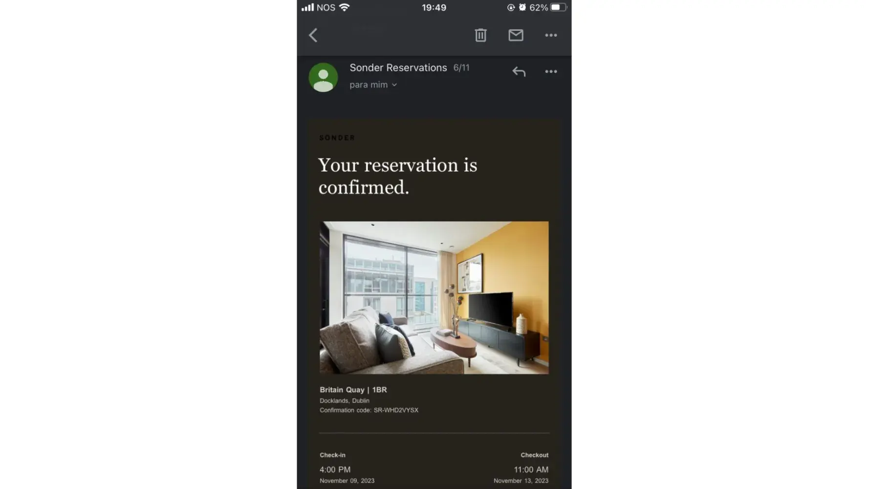However, again some days pass, and on November 6th, my girlfriend receives another email, this time confirming the booking, but to a COMPLETELY DIFFERENT apartment than the one we booked initially, named "Britain Quay". Upon seeing this mistake, my girlfriend reached Sonder through their application's chat and reported the issue. By chat, they were able to "solve" the problem, stating it was caused by an error in their service. After the chat concluded, they told her that nothing else was needed from our side, everything was aligned and we received an email with all the check-in details to the first apartment we booked, "Mountjoy Square", including the PIN to access the building and the PIN for the lockbox that had the key to the apartment.