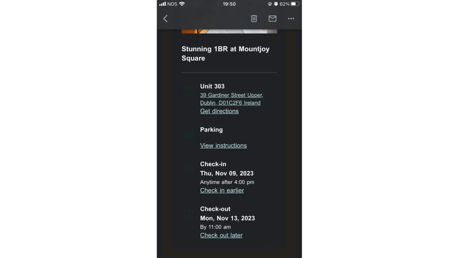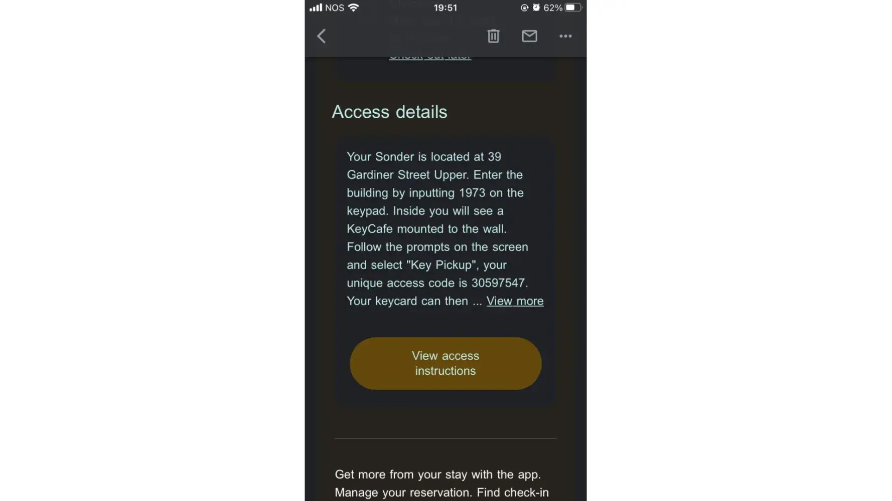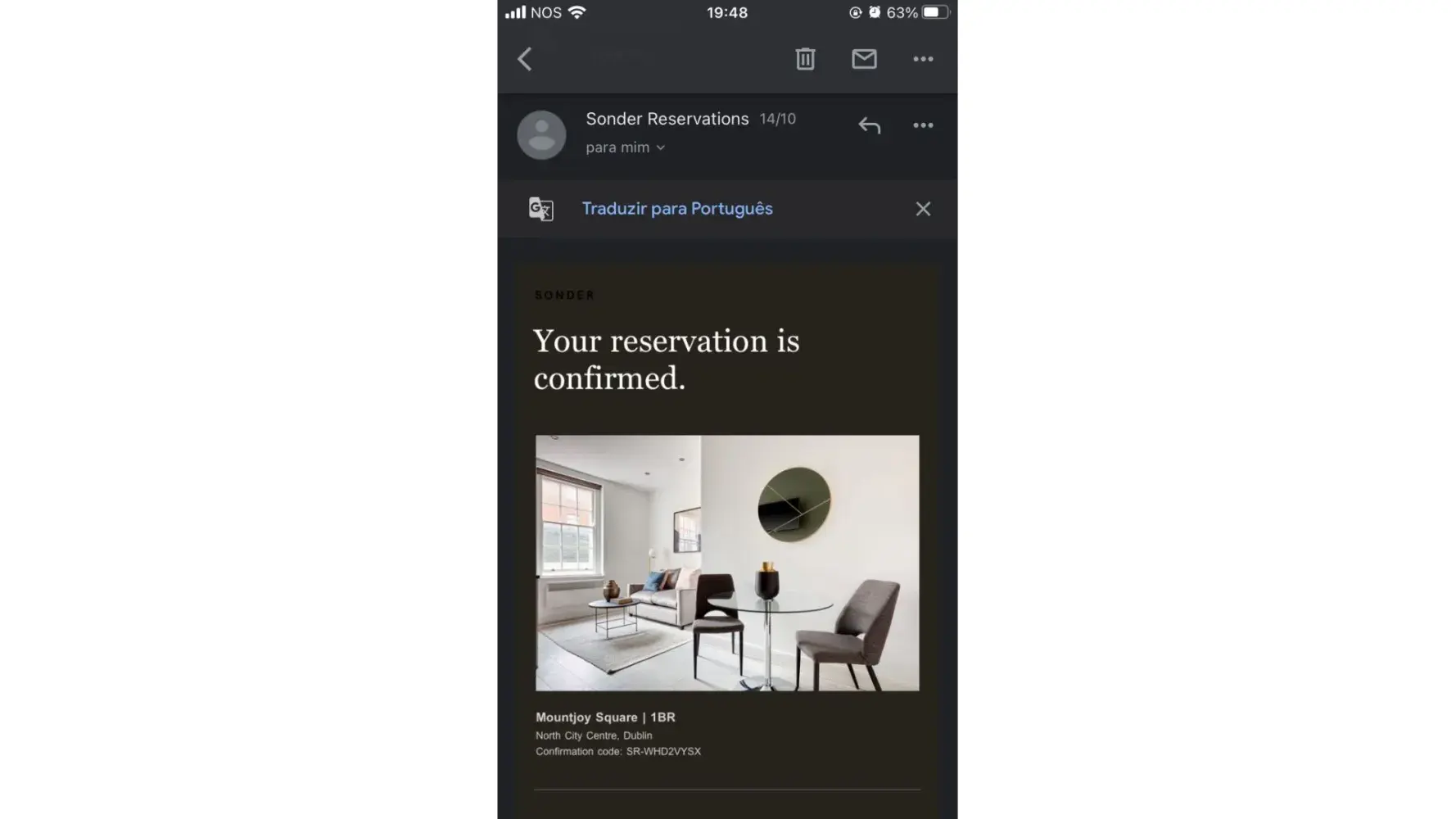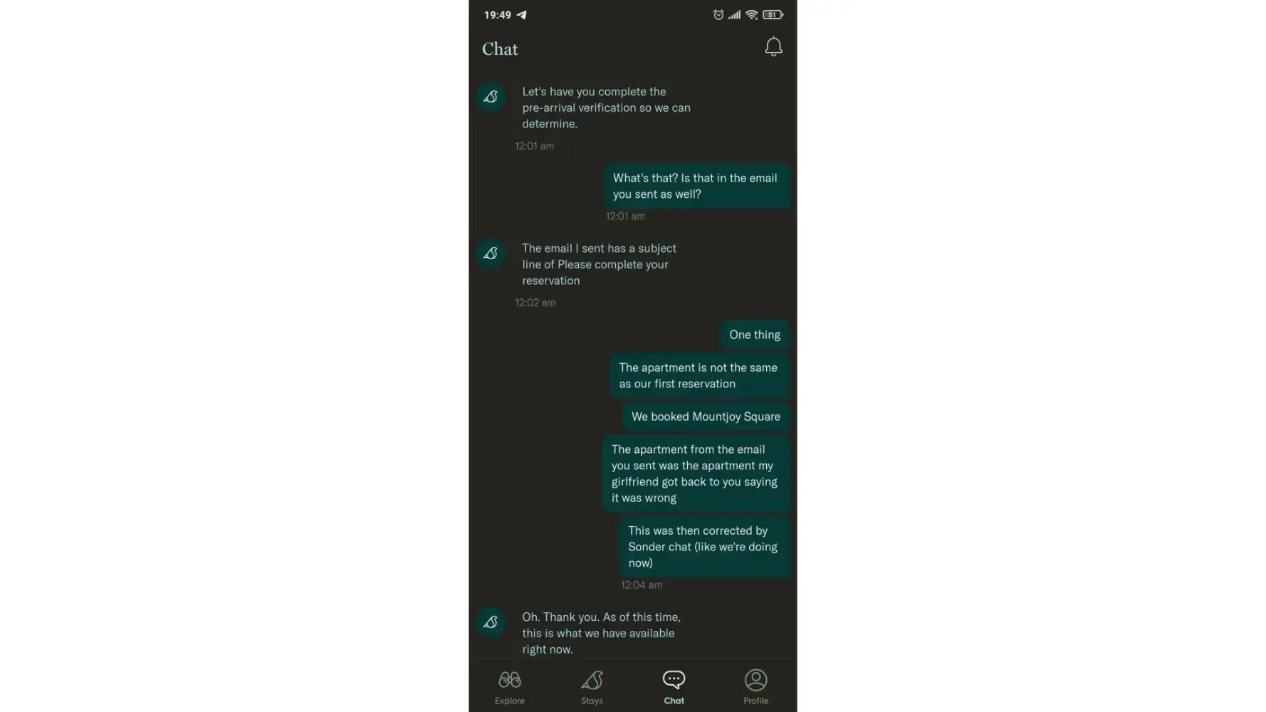 However, again some days pass, and on November 6th, my girlfriend receives another email, this time confirming the booking, but to a COMPLETELY DIFFERENT apartment than the one we booked initially, named "Britain Quay". Upon seeing this mistake, my girlfriend reached Sonder through their application's chat and reported the issue. By chat, they were able to "solve" the problem, stating it was caused by an error in their service. After the chat concluded, they told her that nothing else was needed from our side, everything was aligned and we received an email with all the check-in details to the first apartment we booked, "Mountjoy Square", including the PIN to access the building and the PIN for the lockbox that had the key to the apartment.