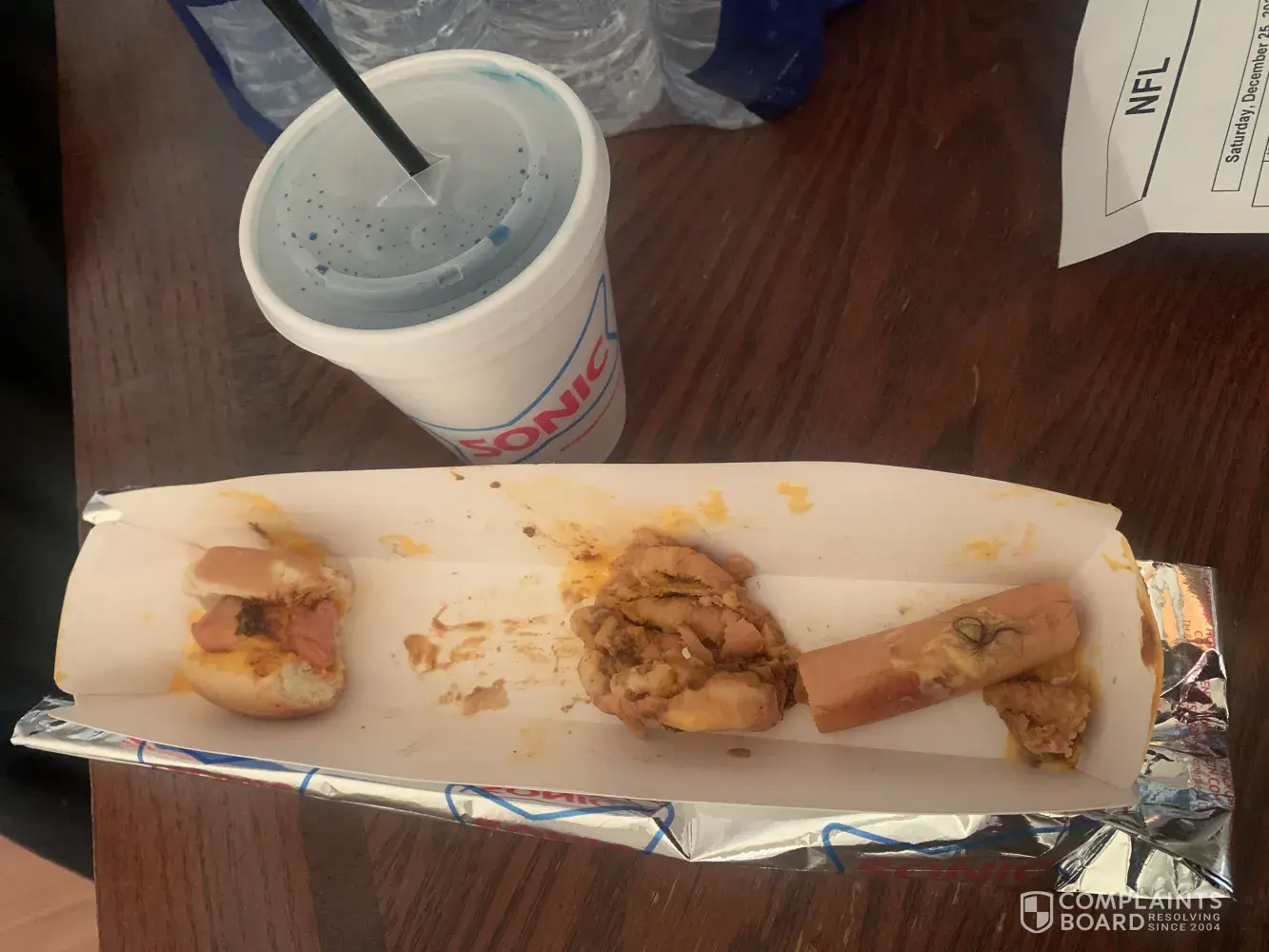Took my daughter to the sonic on Highway 160 a day after Christmas and we had hair a clump of hair in our food I tried contacting the manager he told me to contact you guys I've tried twice to have you guys get back in touch with me and it has not happened so my next phone call do you guys will be from a lawyer. The pictures that I have sent shows you that we had consumed most of the foot-long hotdog when I found the hair in my food and I do not know what my 13-year-old daughter may have not seen but consumed