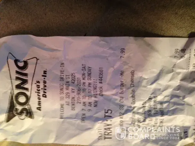 Am sorry i have too complain but people need to know about the sonic in benton ky is terrible. One of the worst burgers, smelled like bad, ever received i just threw it away. Nasty.