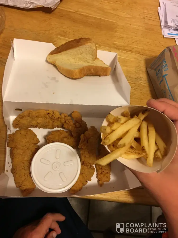 ck#246281 May 4, 2018 16:30 Total order cost 20.00. Ordered Chicken sandwich meal and lg shake. Also ordered chicken strip dinner 3 pc. Comes with 1 onion ring and tater tots, lady taking order said she was leave off tater tots for a few more rings. I did not know there was a additional charge. With that it would not have been so bad if the onion rings could have been consumed. They were HARD, cold. gravy runny like water, toast someone's after thought, more than flat. The strips were luke warm. Had I been team lead I would never send out food cold and hard, and it becomes that when under the light for extended time.