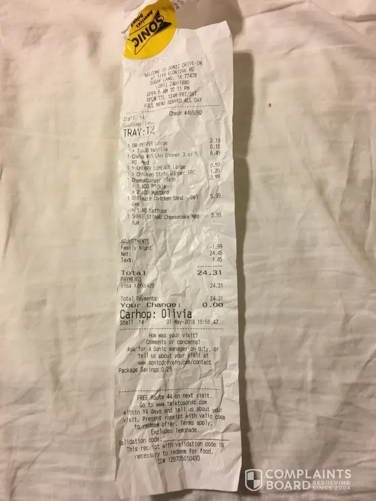 THE QUALITY OF THIS FOOD WAS EXTREMELY POOR! Being completely out of food items is very poor management at this location. Sonic commercials portray food that appears enticing yet there food we received was FAR from the products you sell. I have included a picture of the receipt and the food.