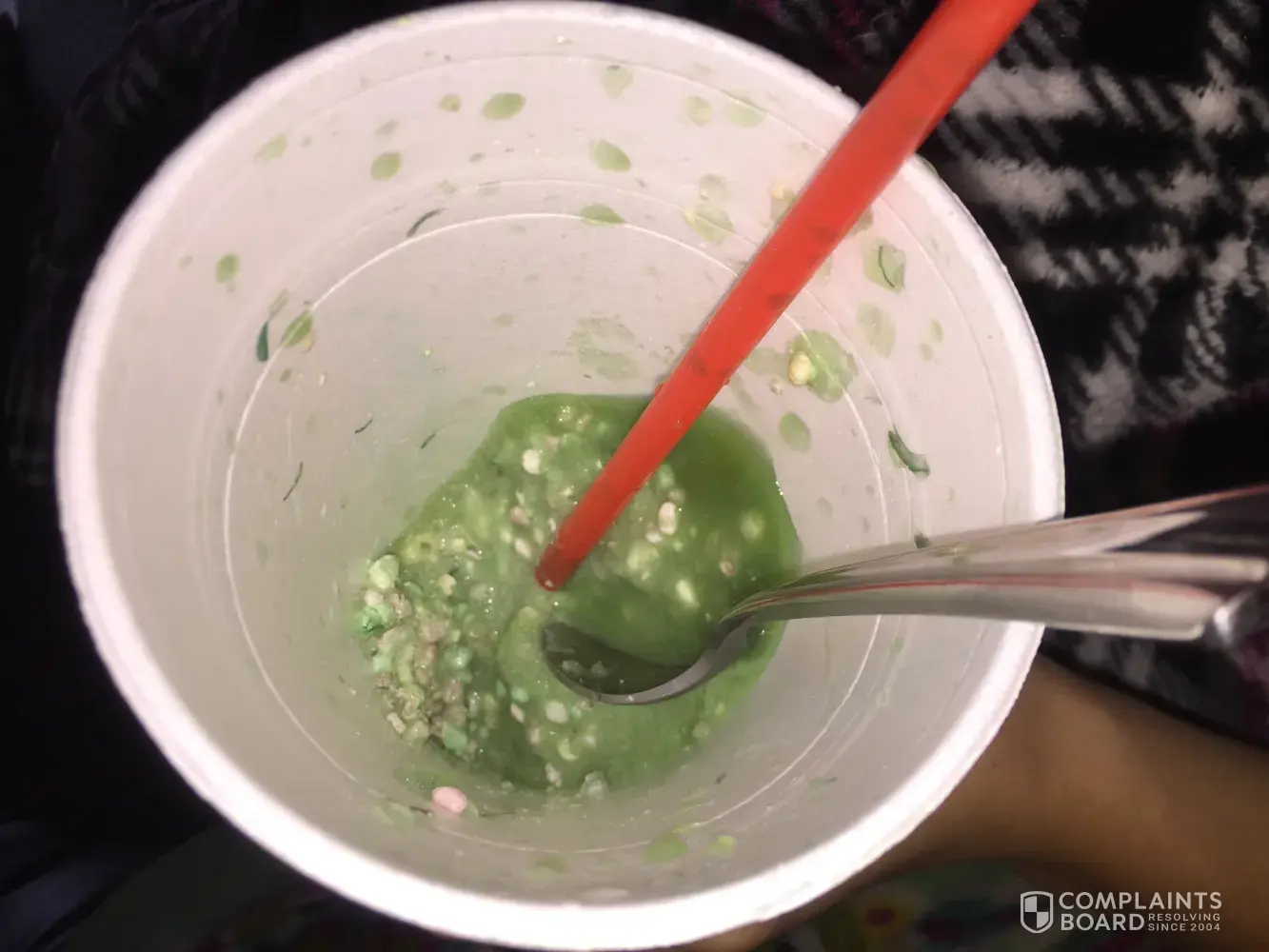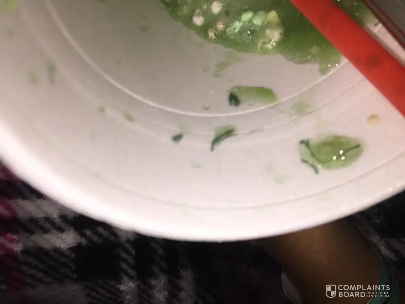 I was drinking a rainbow blue raspberry slush with extra nerds and everything seemed fine when i was drinking it. Then I took the lid off to eat it with a spoon because there were so many nerds (a good thing) and there were weird little things all mixed in the drink. It looked like little pieces of fabric or thread or something. There were tons and tons of them not just like a fluke little piece. I'm very upset because I don't know how much of it got through the straw before I noticed and what it was! Please get back to me with what it was because i'm kind of scared.