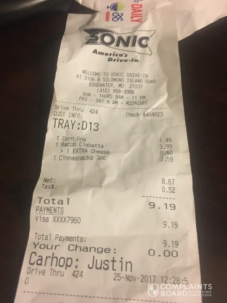I went through the sonic drive-through in Edgewater Maryland today to get a breakfast sandwich and a corndog for my dogs and Cinna snack.