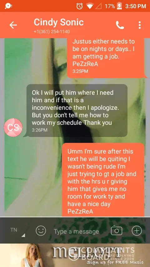 My husband works for the George West sonic drive inn in Texas. When asking the manager Cindy to please either place him on days or nights because I am getting a new job and we shuffel the babysitting between the 2 of us we have three kids and don't have the extra money for daycare... These are the messages I got in return. Not to mention I had a confrontation with a night manager name Crystal had come to my house to ask me "what was my problem" when I ask for husband to come home for help. This sonic is unprofessional and a scam.