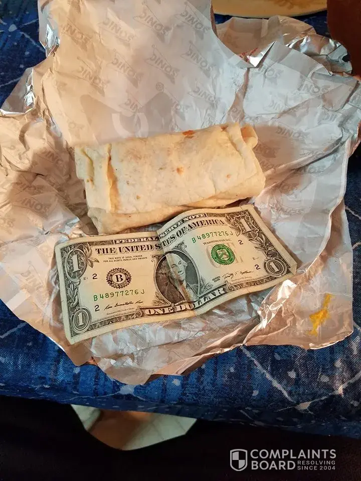 I guess this could be filed under both service and product. I arrived at the Sonic Drive-In (in Norfolk, Nebraska) at 7:45 p.m. and was in a hurry, so I went through the drive-thru. Little did I know the mistake I would be making because my food did not arrive until 8:17 p.m. I kept telling myself that because the wait was so long it's probably because they were carefully preparing the product. My food arrived and upon opening the product I was severely disappointed. I ordered a premium breakfast burrito and a bacon breakfast burrito. Image #00 is the bacon breakfast burrito which was smaller than a taco. I hoped after paying almost seven bucks for the premium breakfast combo that would not disappoint. As you can see by image #02, that burrito was even smaller than the previous one and I added the dollar bill next to it as a size comparison. If I had known I would wait over 32 minutes for essentially two tacos, I would have gone elsewhere. The only positive from this experience was they got my chocolate coke correct. I do not feel like I received over $10 in food and will probably not be back to Sonic for some time.