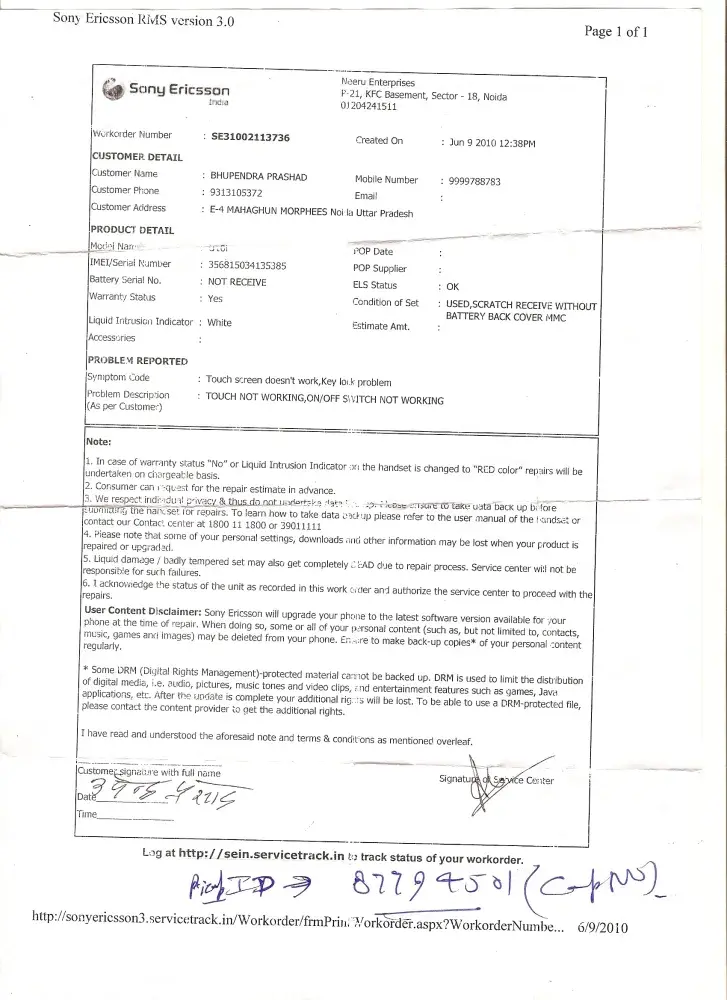 IMEI no [protected]) on 07/01/10 from Neeru Enterprises, Sec 18, NOIDA.