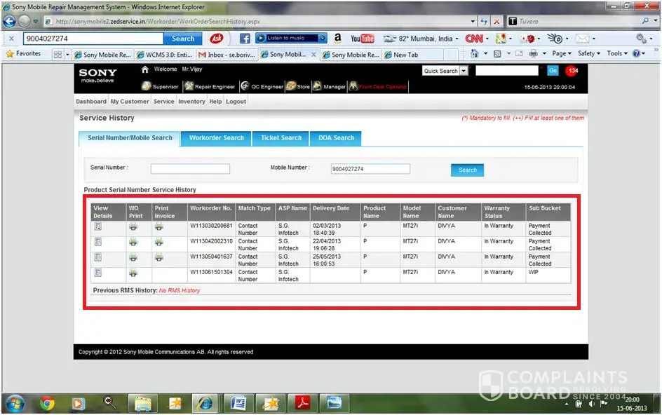 This is regarding the complaint that I had registered for my Sony Xperia Z.