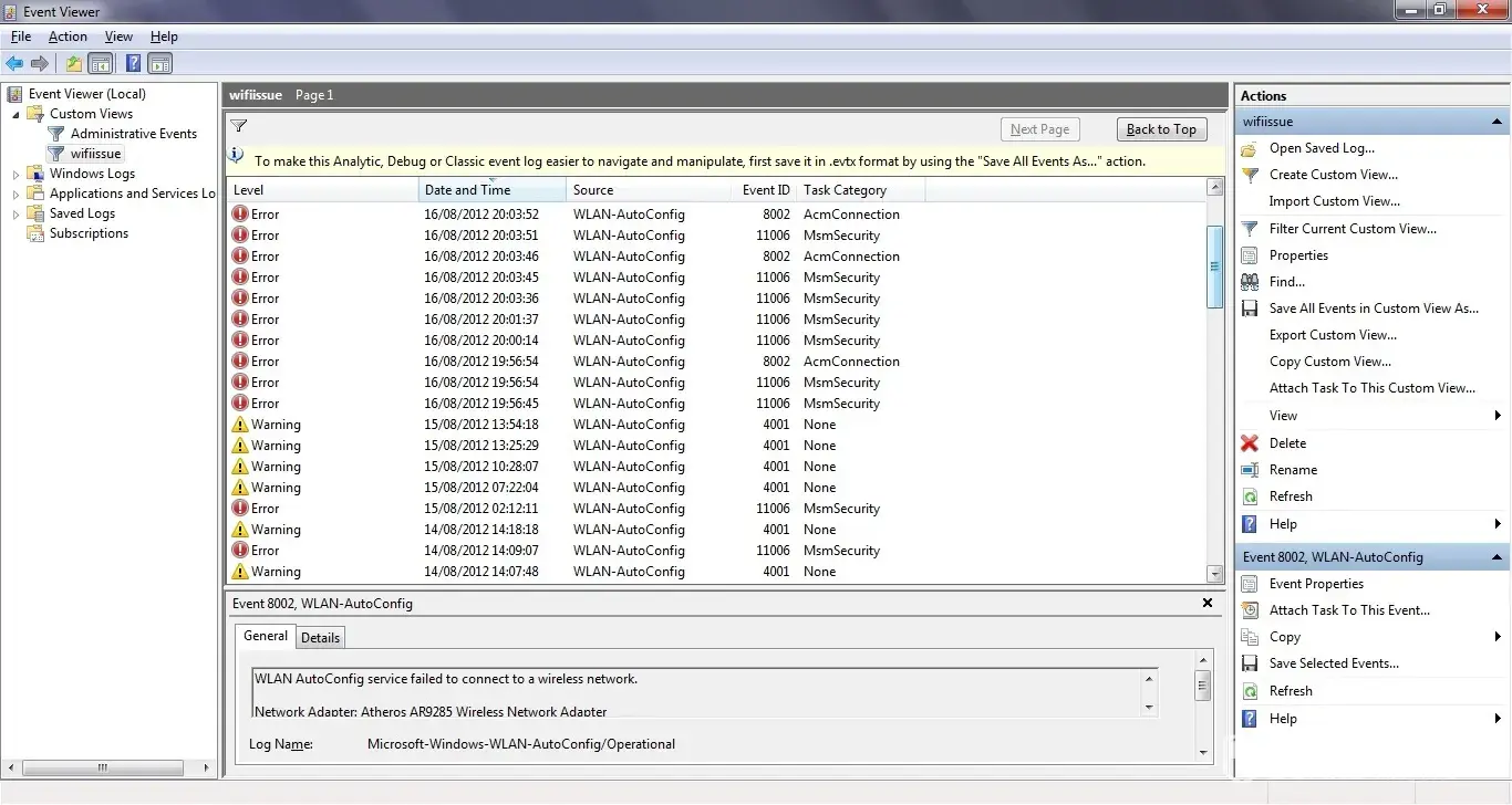 I experienced frequent wireless network disconnection when using my SONY vaio VPCEH laptop. I have another Sony laptop VGNNS20E, Lenovo, PS3 and 3 Samsung mobiles - but none of these experience any wireless issue, so this is not an issue with my router/signal. 1st time when I sent to Sony for repair - sony technical service just replaced the wireless card. I still had the issue. I spent 20 minutes on phone each day with Sony customer service doing all their hardware check tests. I then sent the laptop back to them. They returned it saying they can't reproduce the issue. But I still had the issue and I can't use the internet because it disconnects so frequently. Customer service asked me to try various modes/routers and asked me to send it back to them again, which I did. And this time too, they returned it back saying they can't find the issue in their testing. The windows event viewer error logs, screen snapshots clearly shows the wireless disconnects. The eventviewer showed that the wireless had disconnected even when they had the laptop! But they failed to see this. Such INCAPABLE technical repair team at Sony who can't fix an issue, even after 3 attempts. NEVER BUY SONY LAPTOP AGAIN! Photo of event viewer attached - Sony can't even understand this.