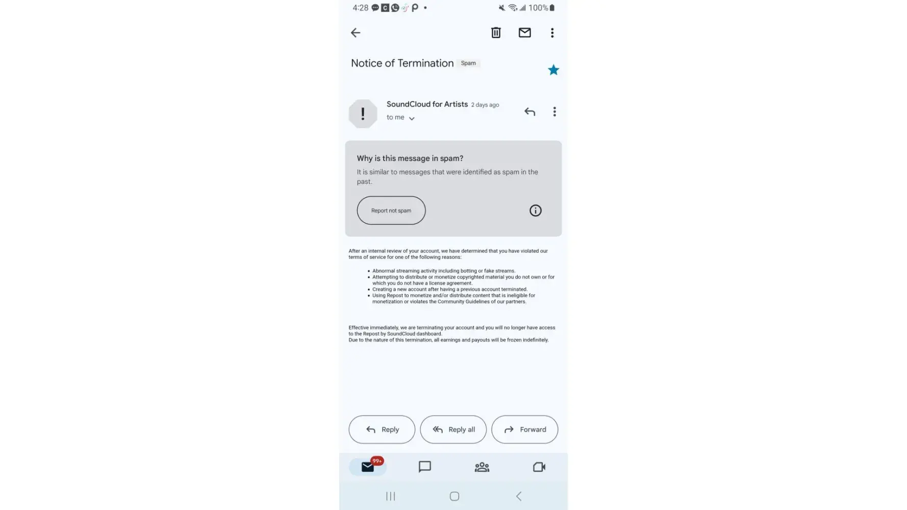Effective immediately, we are terminating your account and you will no longer have access to the Repost by SoundCloud dashboard.