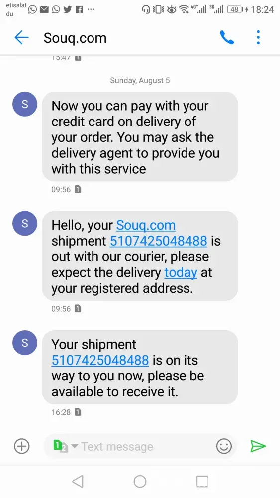 After that I reserved SMSs stating that (Hello, your Souq.com shipment [protected] is out with our courier, please expect the delivery today at your registered address) after I receive one more SMS as follow: