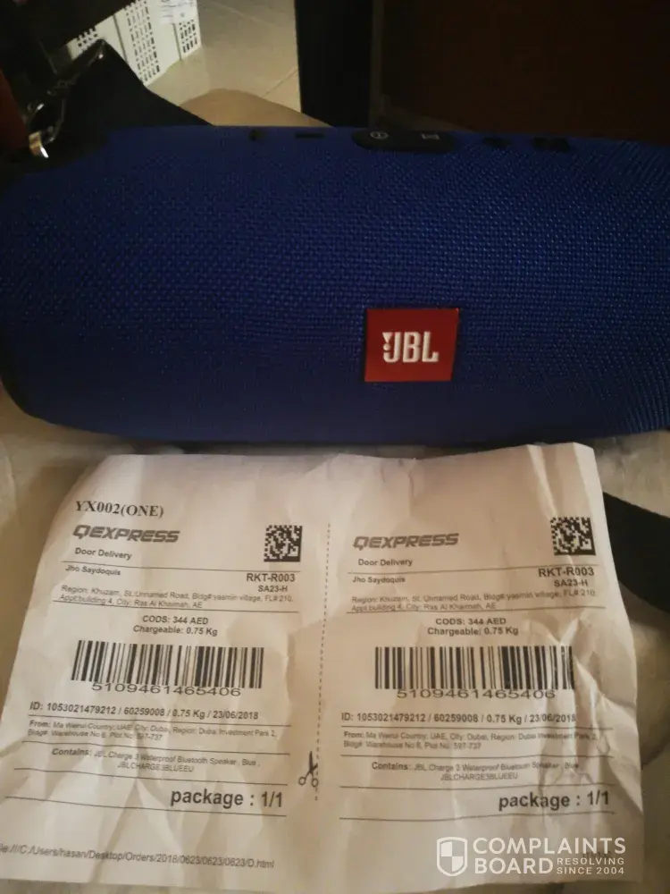 I order jbl charge 3 but they gave me jbl extreme which is fake as well.The express who made it is q express. It is not acceptable and very dissappointed about the service.I wait for a weeks then this is what happened.Worst experience ever. I want to return this item as well. ID:1053021479212 delivered date is june 26, 2018. I dont know to whom i can contact to return it. Hoping i can return it.