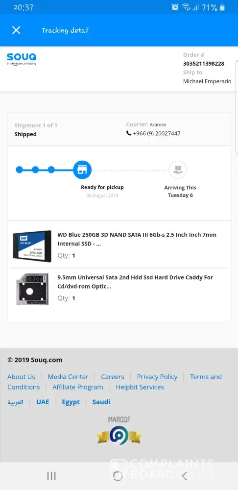 I ordered 2 units of shelving unit on 29 sept 2019. It was supposed to be delivered on 04 October 2019. I called for a follow up when the delivery date passed and the order did not arrive and was told that the delay would only be for 24 hours as the company has some unresolved and undeclared issues. A week has passed and I received a e-mail message that the item is now out for delivery. I waited for one day for the item but it did not arrive. I went to the souq website and tracked my order. Behold they declared that I received my order that very same night! I called customer service again and asked about this and truthfully told them that I have not received the order, The souq website still lists my order up to this day as out for delivery. I was told by the customer service that they will start an investigation and complaint on my behalf and that I can expect a result within 24 hours. I waited for 5 days and decided to call customer service again. I asked about my order and was immediately told that the item was too heavy (gross weight according to website was 10kg). but it will be delivered this coming week. I then inquired about the complaint supposedly filed on my behalf but was told that nobody filed any complained then when I asked again I was told that there was a complaint filed but there was no answer. It is obvious to me now that this company cannot solve my problem and is misleading and delaying me.