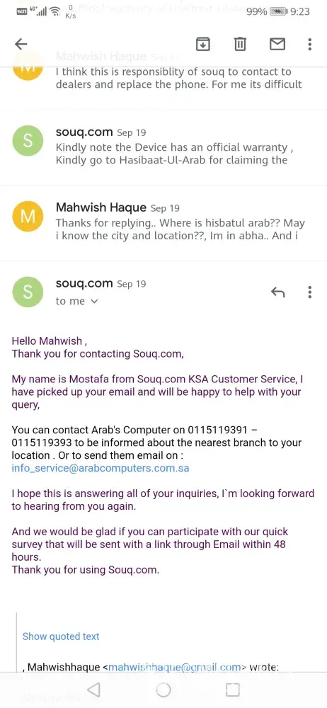 I trust souq, I want them to collect and solve the problem by there own, and replace my mobile.