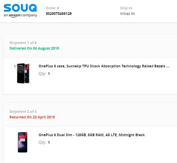 Purchased OnePlus 6 mobile phone on 4 Aug 2018 with 2 years souq warranty, From last month I was facing issues with device, as frequent restart screen flickering, apps auto signout... so i requested return/refund on 23rd April 2019.