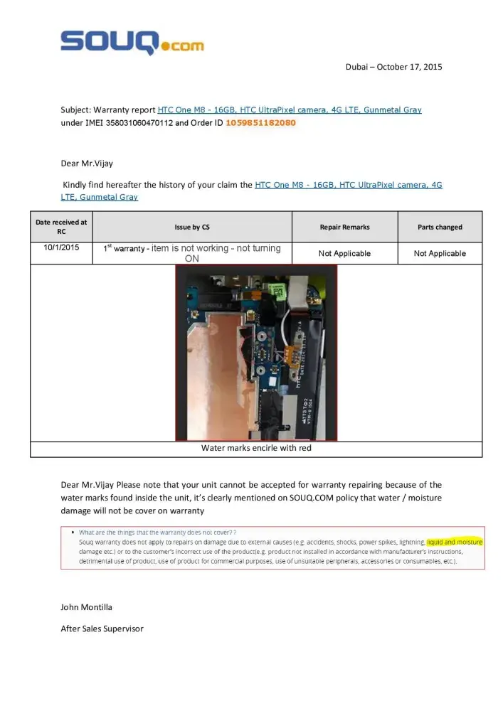 I have purchased one phone (HTC M8) and used only 2 week, got damaged and now they r saying they cannot give guarantee. After raising the compliant they came and collected my phone for Servicing because phone getting switch off sometimes that time phone was in working condition, then they delivered after few days and went back with out saying anything and I try to open phone is not working. I called 8 to 10 times to their customer service to get a response. They are saying the phone got water damaged. then how it was working the time they collected from my side. They send me report regarding this that document not having any Sign or Seal. Am sure something went wrong from their Technician Side. Please help me regarding this issue *Details Attached