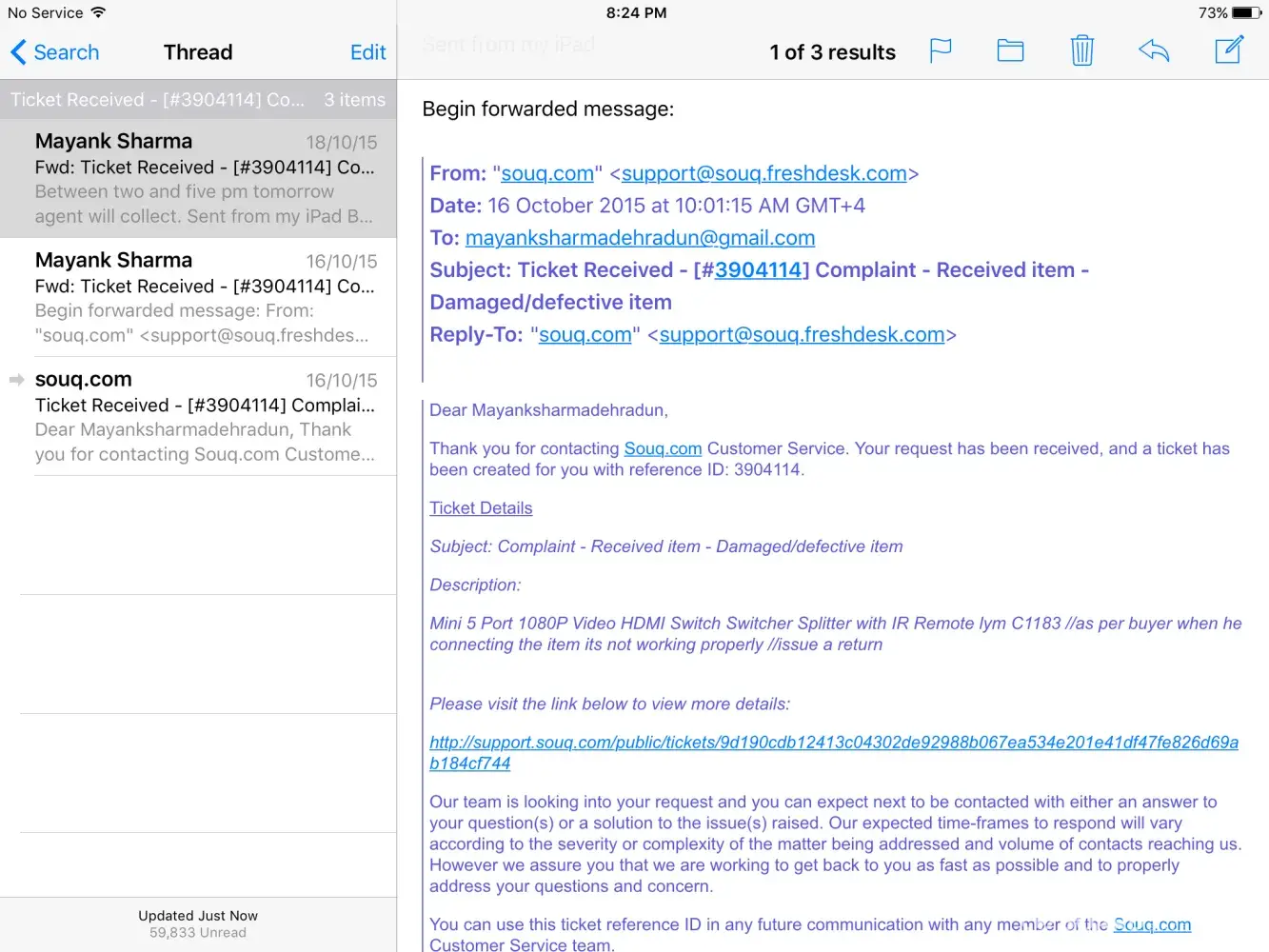 Sent from my iPad Begin forwarded message: From: Mayank Date: 2 November 2015 at 8:07:10 PM GMT+4 To: "souq.com" Cc: [protected]@gmail.com Subject: Re: Ticket Received - [#3979337] Complaint - Return - Technical issue How is this ticket closed even after so many reminders and calls and promises to collect from your end, please reopen and collect defective item Sent from my iPad On 02-Nov-2015, at 8:04 PM, Mayank wrote: Reminder Sent from my iPad On 01-Nov-2015, at 10:42 PM, Mayank wrote: Still await collection between 1400 to 1700 hrs. Sent from my iPad On 30-Oct-2015, at 11:54 PM, Mayank wrote: Reminder Sent from my iPad On 30-Oct-2015, at 12:49 AM, Mayank wrote: Still await collection Sent from my iPad On 26-Oct-2015, at 7:47 PM, Mayank wrote: Still await collection no contact done by courier for collection Sent from my iPad On 25-Oct-2015, at 8:40 AM, souq.com wrote: Dear Mayanksharmadehradun, Thank you for contacting Souq.com Customer Service. Your request has been received, and a ticket has been created for you with reference ID: 3979337. Ticket Details Subject: Complaint - Return - Technical issue Description: Dear Customer, Thank you for contacting us. We are currently working on your query and one of our customer care representatives will contact you shortly. Thank You, Customer Care Team. Please visit the link below to view more details: http://support.souq.com/public/tickets/14ae4df32c397754c305248f0beb45e467543c05569477127c9712813ca2ea8a Our team is looking into your request and you can expect next to be contacted with either an answer to your question(s) or a solution to the issue(s) raised. Our expected time-frames to respond will vary according to the severity or complexity of the matter being addressed and volume of contacts reaching us. However we assure you that we are working to get back to you as fast as possible and to properly address your questions and concern. You can use this ticket reference ID in any future communication with any member of the Souq.com Customer Service team. Thank you and wish you all the best, Souq.com Customer Service Team 3979337 Sent from my iPad Begin forwarded message: From: "souq.com" Date: 20 October 2015 at 11:33:53 AM GMT+4 To: [protected]@gmail.com Subject: Ticket Received - [#3939954] Inquiry - Return - Return status Reply-To: "souq.com" Dear Mayanksharmadehradun, Thank you for contacting Souq.com Customer Service. Your request has been received, and a ticket has been created for you with reference ID: 3939954. Ticket Details Subject: Inquiry - Return - Return status Description: Buyer called for return update Please visit the link below to view more details: http://support.souq.com/public/tickets/ee10ef3772d89f8b97034357c86935336376bd853f5923f7d25bfa80d8c612ba Our team is looking into your request and you can expect next to be contacted with either an answer to your question(s) or a solution to the issue(s) raised. Our expected time-frames to respond will vary according to the severity or complexity of the matter being addressed and volume of contacts reaching us. However we assure you that we are working to get back to you as fast as possible and to properly address your questions and concern. You can use this ticket reference ID in any future communication with any member of the Souq.com Customer Service team. Thank you and wish you all the best, Souq.com Customer Service Team 393995 Sent from my iPad Begin forwarded message: From: "souq.com" Date: 20 October 2015 at 11:33:53 AM GMT+4 To: [protected]@gmail.com Subject: Ticket Received - [#3939954] Inquiry - Return - Return status Reply-To: "souq.com" Dear Mayanksharmadehradun, Thank you for contacting Souq.com Customer Service. Your request has been received, and a ticket has been created for you with reference ID: 3939954. Ticket Details Subject: Inquiry - Return - Return status Description: Buyer called for return update Please visit the link below to view more details: http://support.souq.com/public/tickets/ee10ef3772d89f8b97034357c86935336376bd853f5923f7d25bfa80d8c612ba Our team is looking into your request and you can expect next to be contacted with either an answer to your question(s) or a solution to the issue(s) raised. Our expected time-frames to respond will vary according to the severity or complexity of the matter being addressed and volume of contacts reaching us. However we assure you that we are working to get back to you as fast as possible and to properly address your questions and concern. You can use this ticket reference ID in any future communication with any member of the Souq.com Customer Service team. Thank you and wish you all the best, Souq.com Customer Service Team 3939954 Sent from my iPad Begin forwarded message: From: Mayank Date: 19 October 2015 at 10:29:24 PM GMT+4 To: "souq.com" Cc: [protected]@gmail.com Subject: Re: Ticket Closed - [#3925680] Negative Feedbak - Order ID: [protected] - Seller:cellsafe - Marketplace Dear Sir/Madam, The article was supposed to be collected by courier today between two and five pm as per my telephone conversation with customer care yesterday but sadly the courier is calling me at ten am in morning when I am not there or anyone from family also not there .So please arrange for courier to collect and return between two and five pm Thanks Mayank Sent from my iPad On 19-Oct-2015, at 1:28 PM, souq.com wrote: Dear Mayanksharmadehradun, Thank you for contacting Souq.com Customer Service. As we have not heard from you for a while; we hope that our solution and response has met your expectations. Hence we are closing the ticket. Ticket Details Subject: Negative Feedbak - Order ID: [protected] - Seller:cellsafe - Marketplace Description: Feedback Comment: Item does not work as described Item Info: Title: Mini 5 Port 1080P Video HDMI Switch Switcher Splitter with IR Remote lym C1183 Price: 3066 EAN: [protected] Offer Note: Buyer Info: Nickname: Mayanksharmadehradun Seller Info: Nickname: cellsafe Response sent: Please visit the