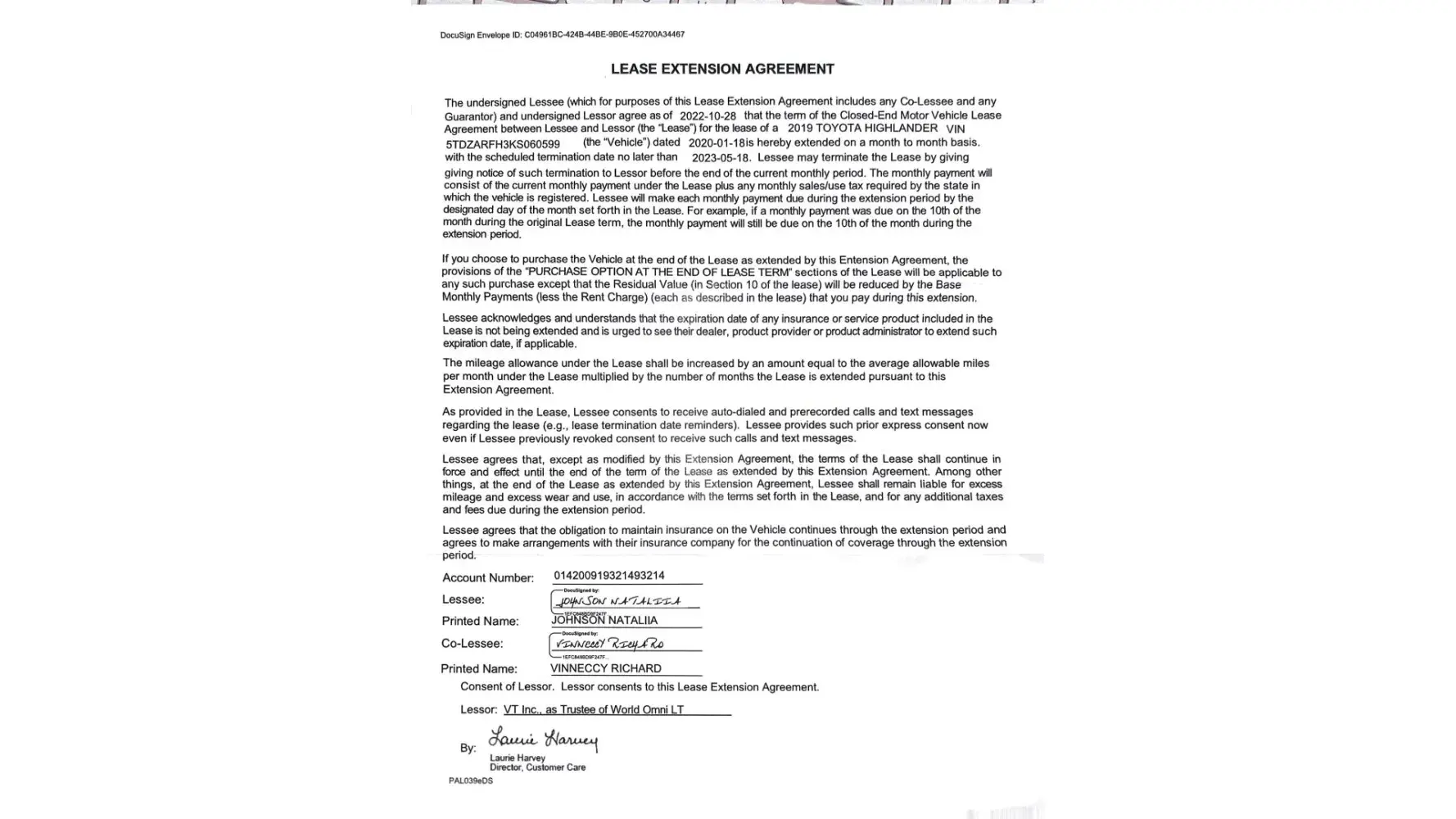 My Client, Ms. Grisell Sanchez, leased a 2018 Toyota Corolla on or about 02/28/2018 for a term of 35 payments. The lease, pursuant to the agreement, terminated on Jan 2021. On January 30, 2021, pursuant to paragraph 40 of said agreement, the vehicle was returned to Toyota of North Miami; ending mileage 34354. Then on February 12, 2021, my client retuned to Toyota of North Miami the vehicle's extra key. We have copies of the Lease Termination Acknowledgement document.
