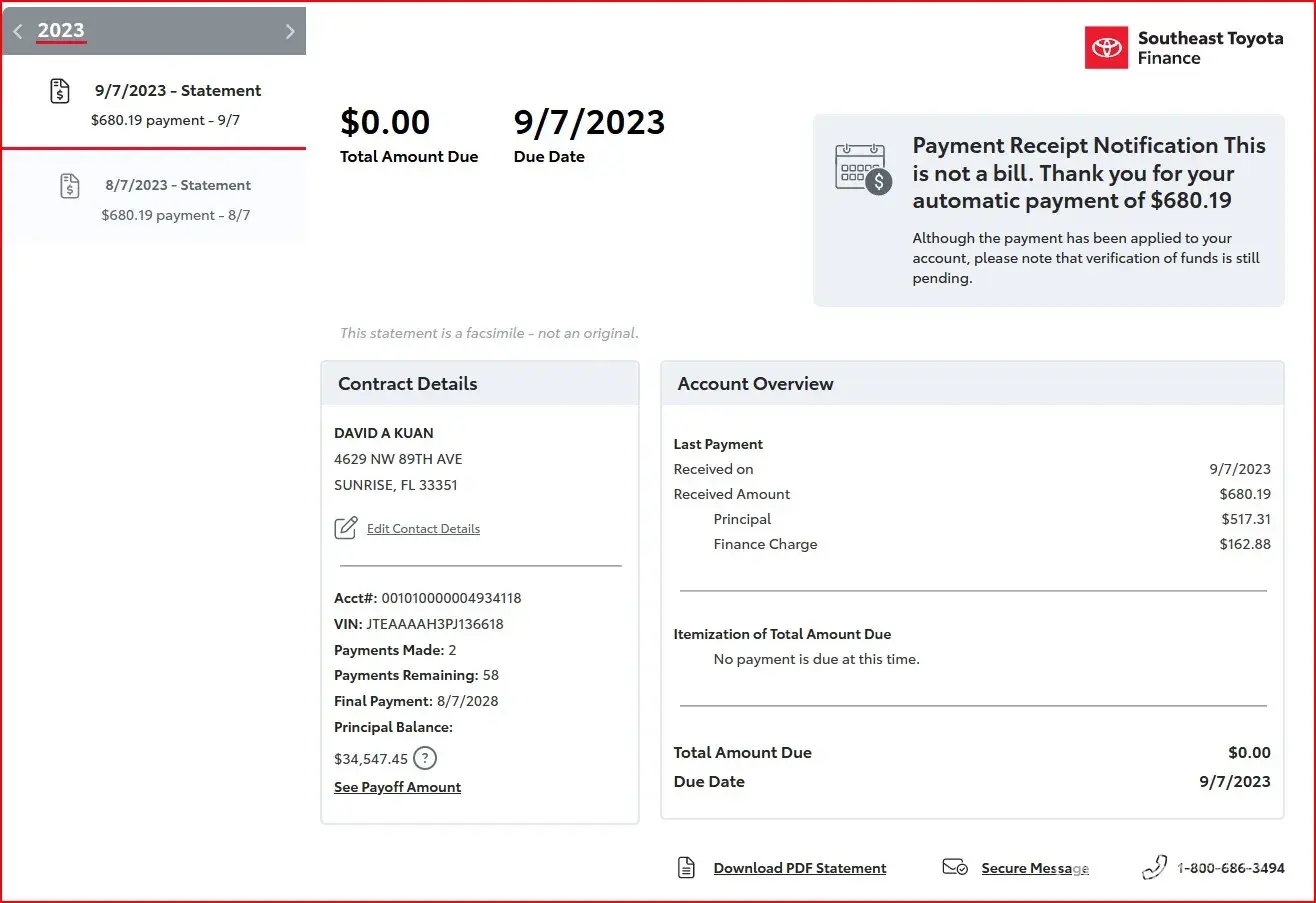I purchased a Toyota Venza 2023 on July 24th 2023, with my first payment due September 7th. Enrolled in SETF autopay in August 3rd, and they unexpectedly withdrew the first payment in August 7th, not September 7th.