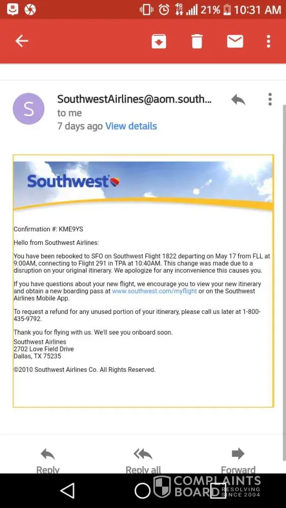 In final l write to you to consider full compensation for our unfortunate expense, and also a written letter of apologies from your Fort Lauderdale supervisor George. If this is not resolved immediately, we both will seek legal recourse against Southwest Airlines.