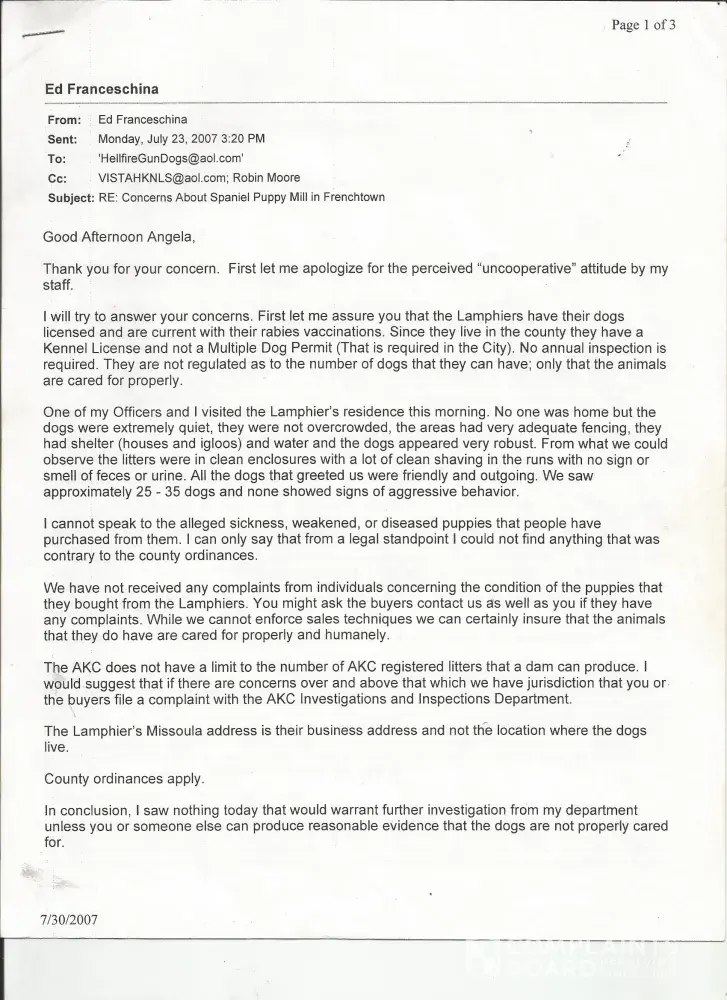 Please see the attached response from Ed Franceschina (an AKC inspector) to Angela Monaghan, which is just one piece of paper out of many boxes that I have collected over the years showing her obsession & lies. She has used these officials as a form of harassment, with every one of them proving her accusations to be false.