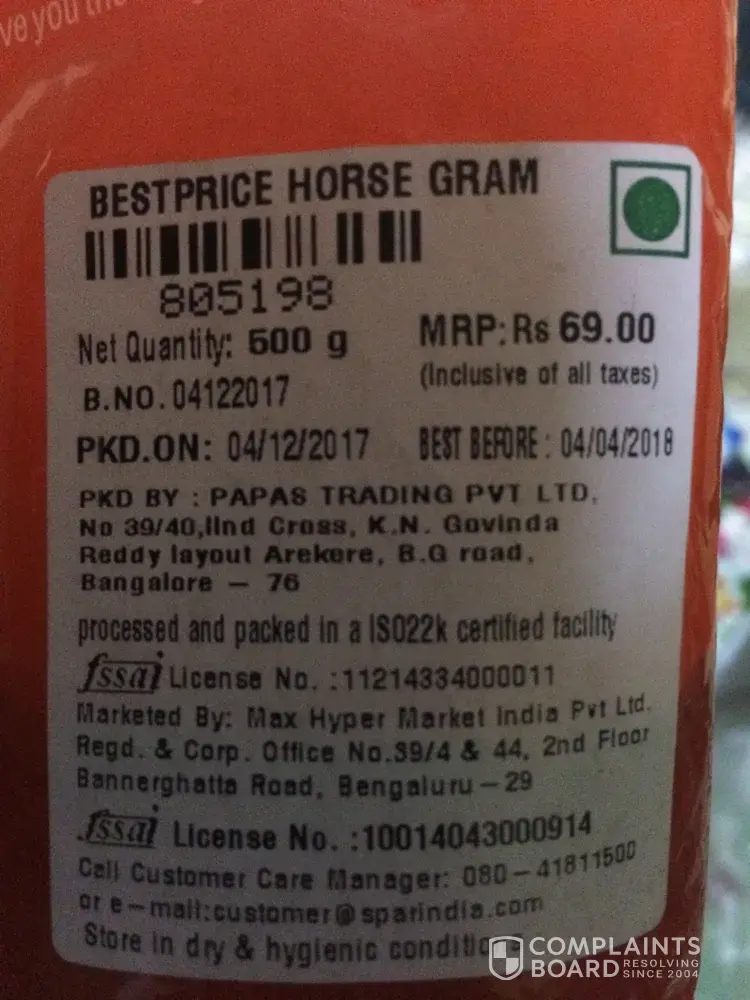 I have brought horse gram from the hyper market in vadapalani chennai it's bar code is805198 batch no is [protected] packed date is 4/12/17 and exp st is 4/4/18 when I opens the product I was shocked to see insects inside which I brought from a reputed store like yours