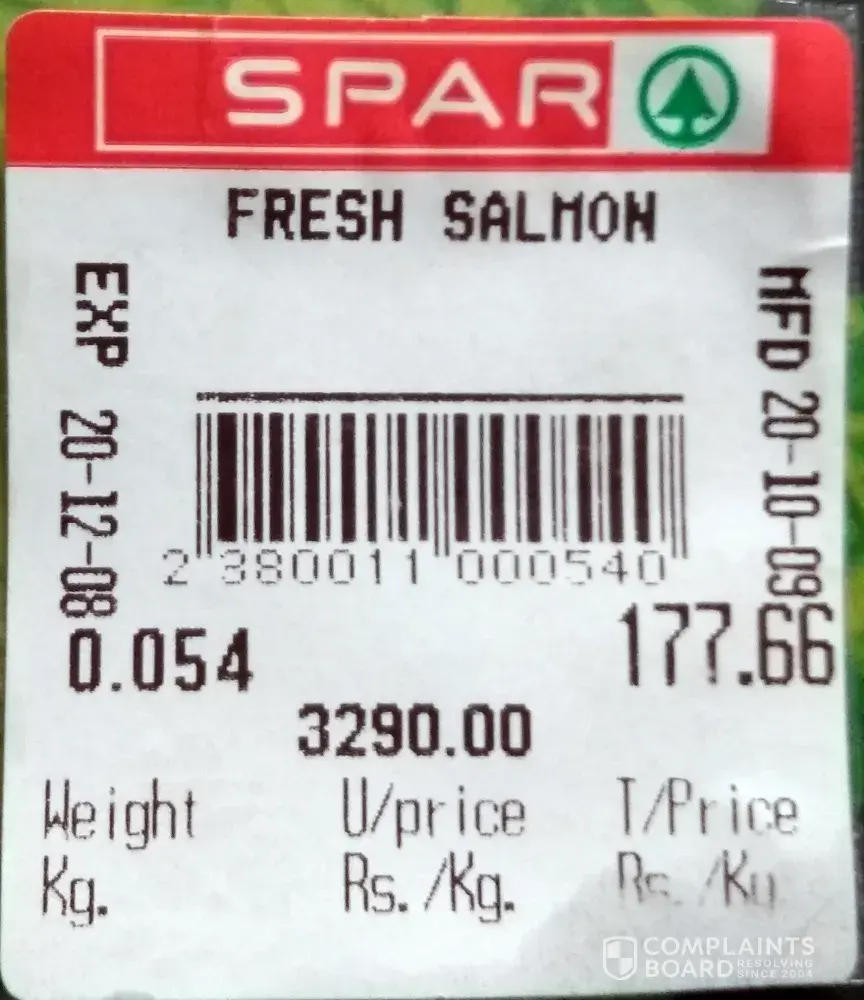 My complaint regards the packaging and pricing of smoked salmon. I bought some salmon yesterday - the label is attached. When I opened the package I found that the salmon weighed 46 g, not 54 g as stated on the label. Therefore, the balance of 8 g was the plastic packaging. I am not going to pay Rs.26, a significant proportion of the total cost, for a piece of plastic.