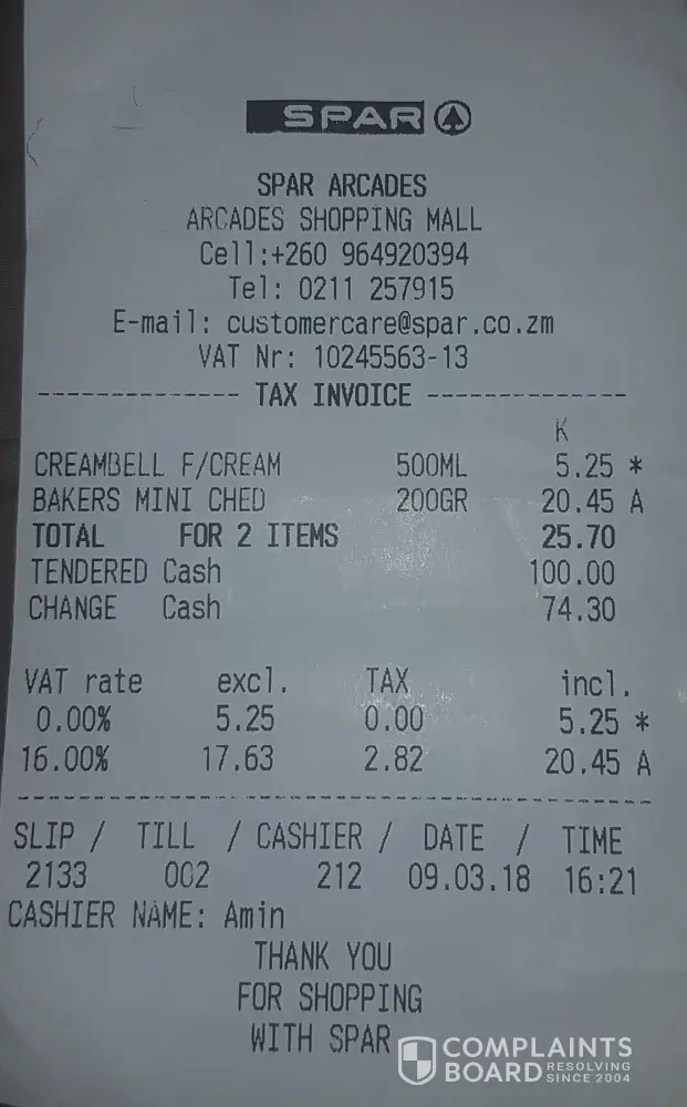 On 9.3.18 I went shopping to Spar Supermarket at the Arcades Shopping Mall in Lusaka, Zambia. Amongst other food stuff, I had bought a Packet of Biscuit. When I opened for Break-Fast on the 12.3 .18, It did not taste good, so I looked at the Expiry Date on the package (Box) and noticed that SPAR had sold me an already expired food product, The same day in the afternoon I went back to Spar and first straight went to the Biscuits Department (Shelves) to find out whether only my packet was expired or were other packets of the same type were also expired.to my surprise there were several packets still on the shelve with expired dates having passed (for which I managed to take photographs whilst on the shelve), I quickly brought this to the attention of the Store Manager,