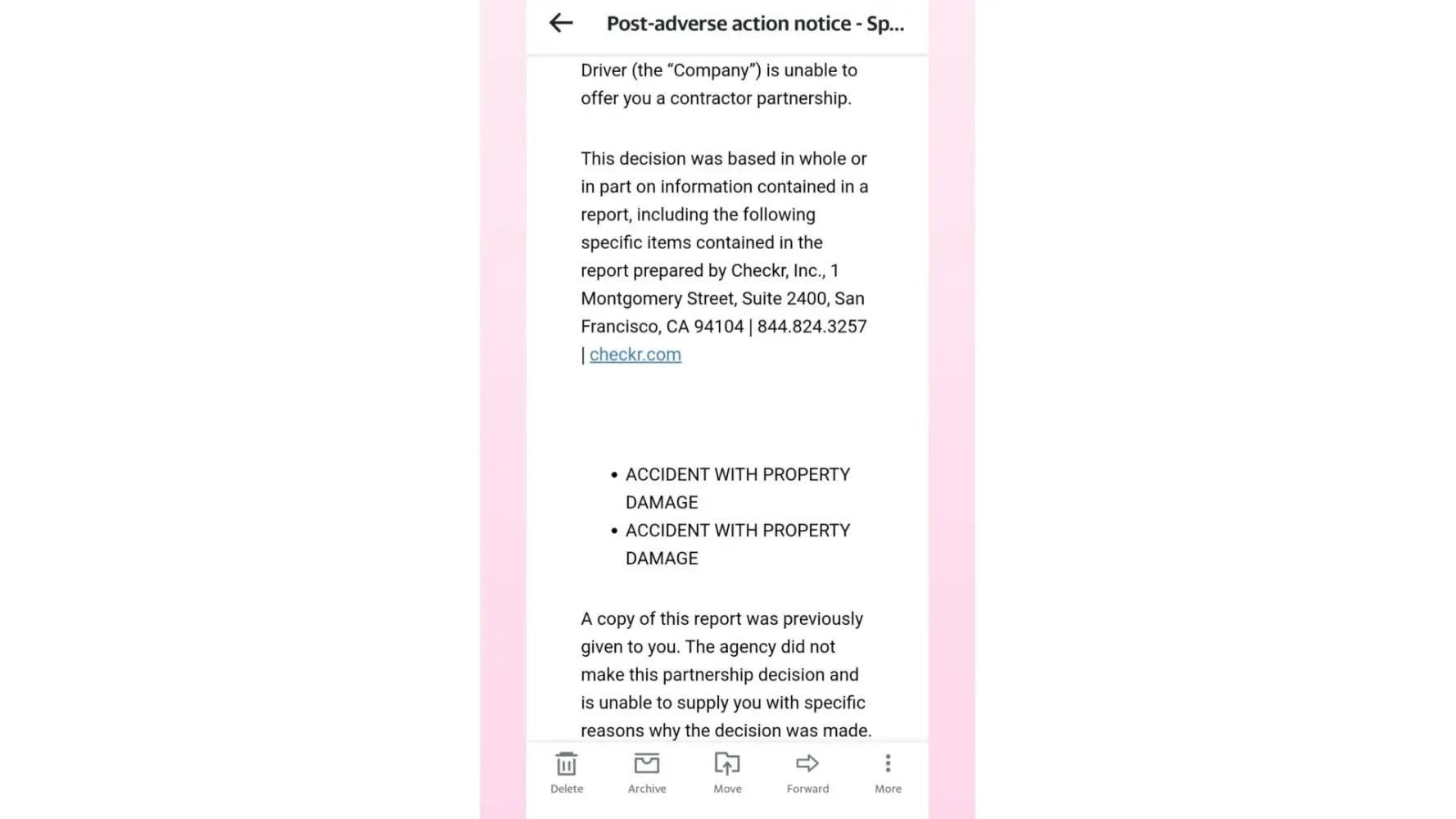 Hi. I recently applied for employment as a spark delivery driver for Walmart. I got denied because of 2 accident reports that showed up in my license when they did the background check. Both I was found not at fault and the other driver paid. I drive a lot as an instacart driver and last year (2022) one driver ran a stop sign and another rear ended me when I wasn't even moving. CLEARLY I was not at fault and the police agreed and both drivers took full responsibility of their actions. HOWEVER now I got denied from Spark because of these 2 reports! I tried explaining it to them over the phone. I got an email stating the same..that they won't hire me because of those 2 accidents. I kept these emails for proof. This is incredibly unfair and discrimatory. This is America. How is this possible? Please help me get justice and make employers be fair.