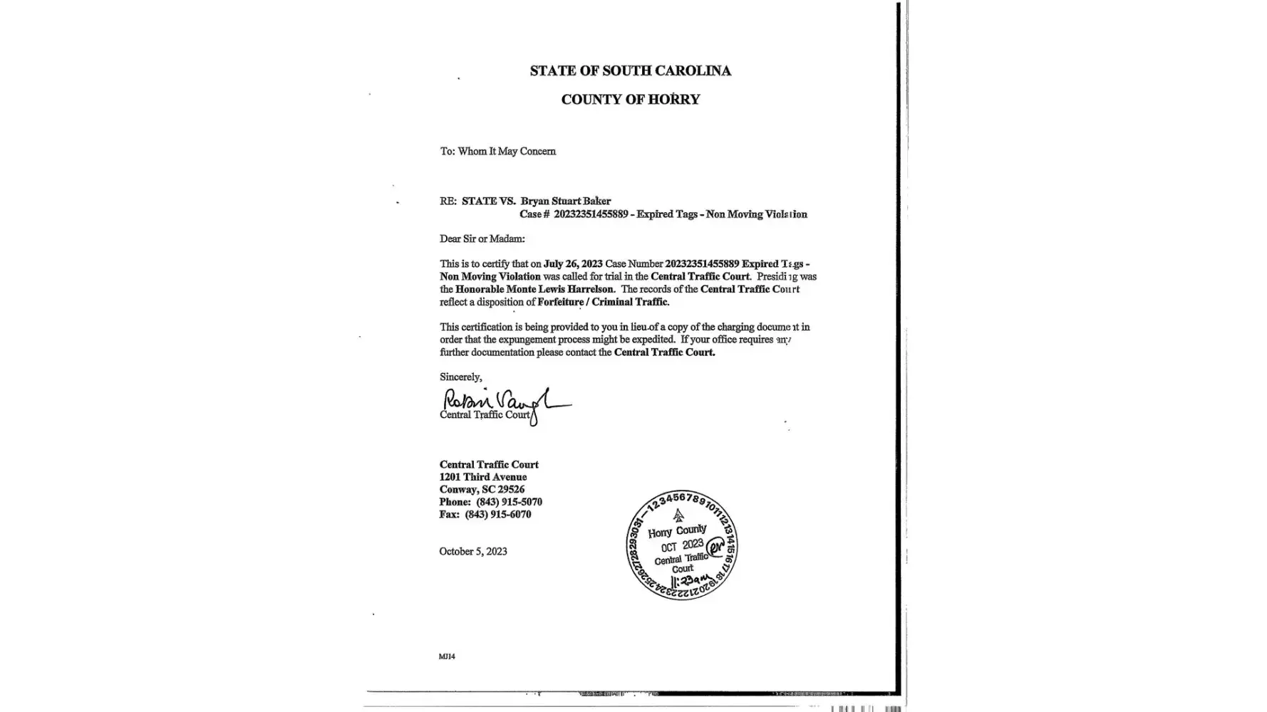 Horry County Traffic Court Document