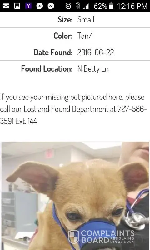 My dog went missing 6/18 so I put reports in at all nearby shelters in Pinellas. I made calls daily to the shelters. On 6/22 I visited Animal Services and visually looked and did not see him so I called SPCA of Tampa Bay and was told that had no animal matching his description and placed a report with them. On 6/23 he appears on their website. He appeared fine in the picture with the muzzle. I called numerous times and left voice mails until finally someone answered. I gave the Animal # from their site & was told he was still there. I advise I would be there at 5:30 to claim him. I arrive and was told he was euthanized earlier. They claim he was hit by a car and was in much pain. I asked to see his body & was told it was already frozen on ice. Then asked if I wanted his ashes for $70! No one notified me even though my info is in their system. I feel they are doing some shady practices.