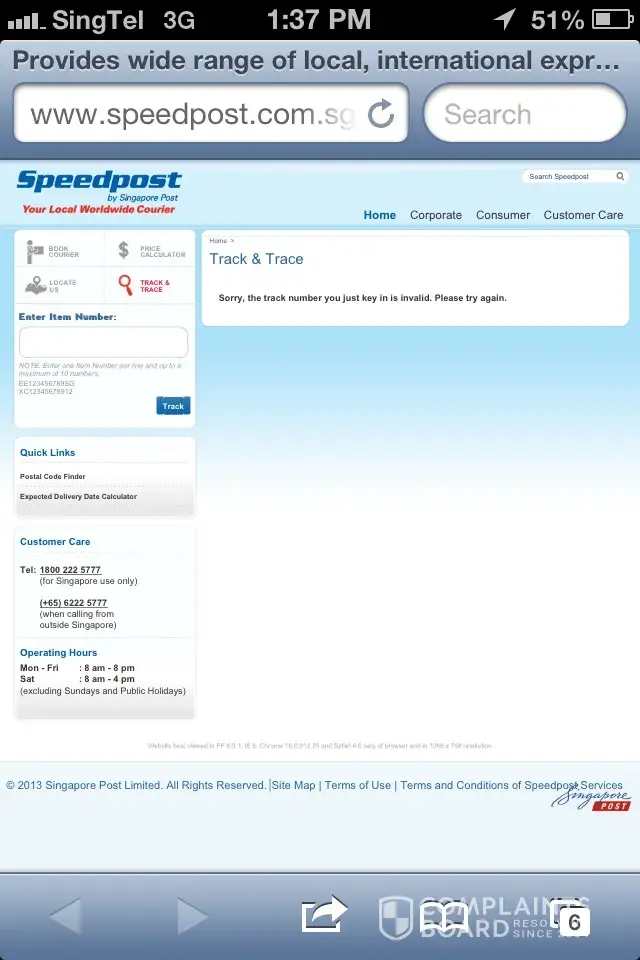 Yet when we call speedpost hotline, the operator asked me to call speedpost paya lebar branch myself without giving me the no to call at all!