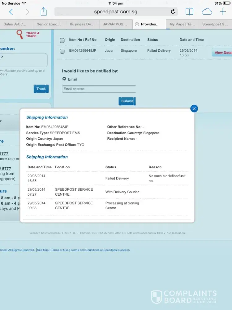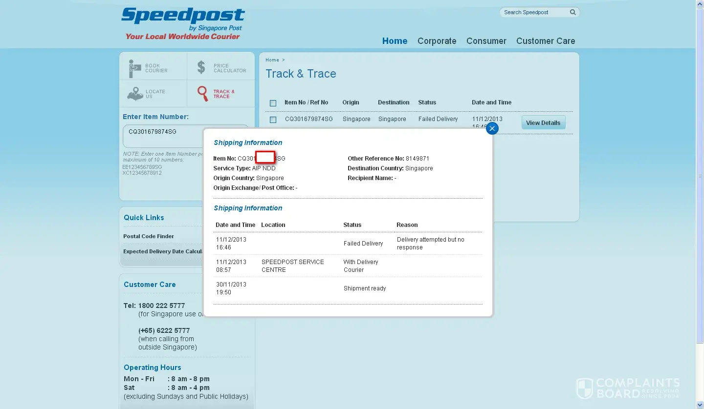 And now, there's no delivery advice from speedpost at all yet stated that delivery attempt failed and no response from us since 6th may til date(21st may)!