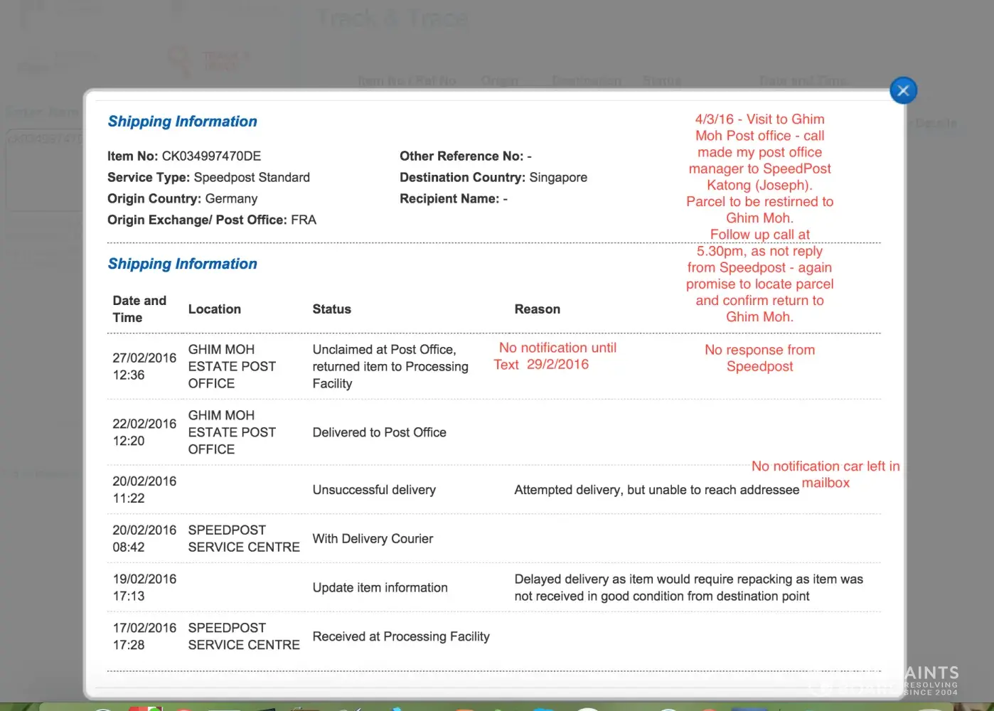 When I realized 2 items from the same dealer whom I've purchase 4 goods from did not reach me, first thing i do were to check with the dealer incase they didn't sent it - but they did and proven by the receiving China's warehouse who arrange delivery to Singpost Singapore using DHL.