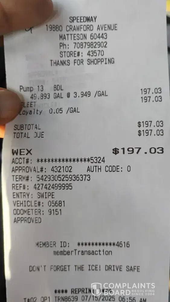 On 7/15/2025 I drove in to purchase diesel posted on sign at 3.49 per gal. When receipt was given it stated 3.949 per gal. I brought purchase amount up to cashier she stated somebody must have forgot to change reader board outside. Price was still not corrected on my receipt or board when I passed company later. Please have someone check out company for price gauging the consumers and businesses in area.