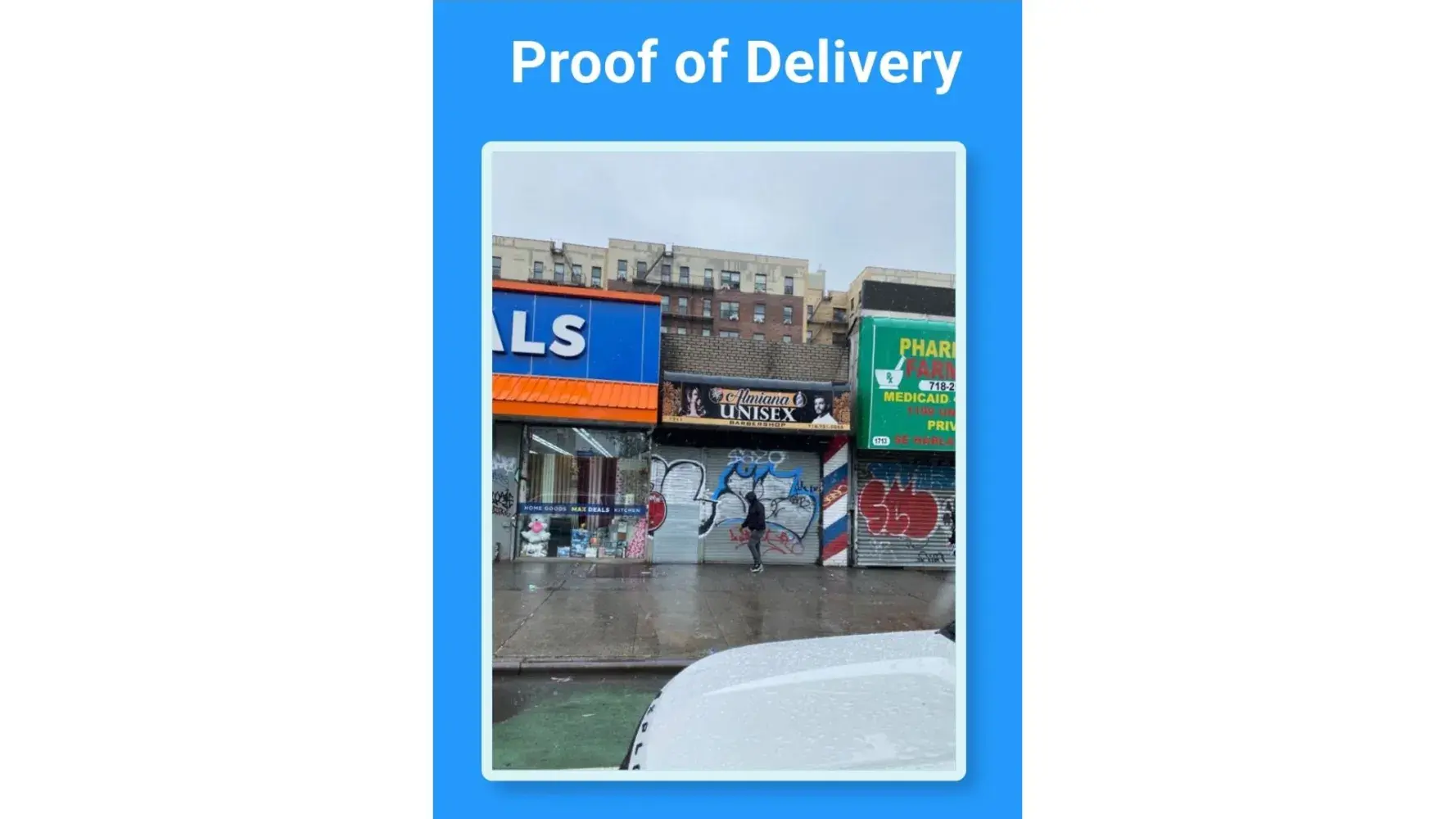The proof of delivery shows a guy with no packages in front of the address gate closed and raining.