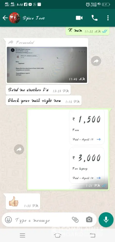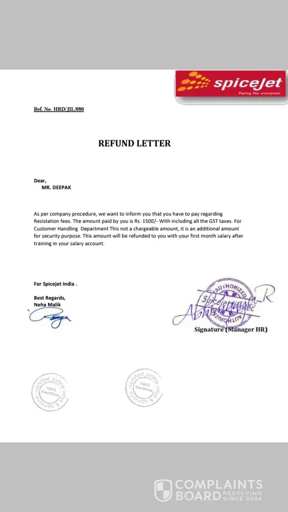I've lost about 5000 rupees for getting fake call letter from spicejet through an lady calling from kempegowda international airport bengaluru telling that we're hiring an ticket executive job at spicejet And also she emailed me refund letter, confirmation letter and training letter I've paid total 5000 to this fake recruiter