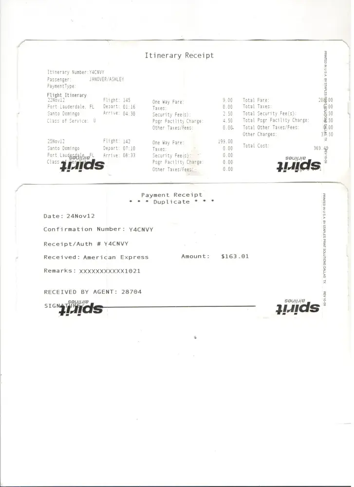 My sister Ashley Janover booked a round trip on Friday, November 9th, 2012 from Fort Lauderdale, FL on November 22nd, 2012, Flight 145; departing at 1:16pm and arriving to Santo Domingo, Dominican Republic at 4:30pm. And back on November 24th, 2012, Flight 142 departing Santo Domingo, Dominican Republic at 5:24pm and arriving to Fort Lauderdale, FL at 6:47pm. Confirmation code for this flight is Y4CNVY. Let me point out that my sister, Ashley suffers from Lyme disease. It affects her nervous system, causing symptoms such severe headaches, numbness, pain, weakness in the limbs, and poor coordination, causing her to take medications; this is why it was extremely important to go back home in Florida on the scheduled flight. Once we arrived at the Aeropuerto Internacional de Las Américas, José Francisco Peña Gómez in Santo Domingo, we were a few minutes late due to Ashley’s condition. We explained the situation clearly and kindly to the Spirit counter attendant Yudith Tolentino, badge # 2691; and she had a very poor attitude and ignored our dilemma. We asked her if she could please print out our ticket and boarding pass, she refused. Then she printed another fellow flyer’s pass right in front of us. We spoke to multiple people about our predicament including Mr. Jose Fernando Rodriguez, Aerodom employee, badge #577, and still received no help. Finally, we located Ms. Tolentino’s supervisor Wilfredo, who was on vacations, put him on the phone and he told her to print the tickets. At that time, it was already too late. They requested we change the flight for the next day, November 25th, 2012; and charged us a completely new ticket. The on staff supervisor Mr. Jose Fernando Rodriguez was condescending as he denied to help saying he couldn’t waive the price. As we returned to the airport the next day, there was a different on staff supervisor who said it wouldn’t be a problem to waive the ticket, due to our position but it was too late since it was already charged. He was very friendly and helpful. He did not understand why nor the Spirit counter attendant Yudith Tolentino or the on staff supervisor the previous day, didn’t do so. He proceeded to charging us US$163.01 for the return ticket.