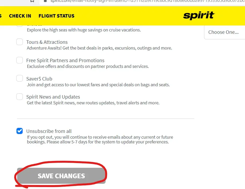 Spirit Airlines does not allow you to unsubscribe from their email list. I started receiving spam emails nearly every day after booking a flight with them. When I navigated to their unsubscribe page through the Unsubscribe link in their email, I found that the page is set up to *prevent* you from actually unsubscribing. The page allows you to check off what type of promotional email you receive from them along with a checkbox to "Unsubscribe from all". However, if you check "Unsubscribe from all", the button to save your changes greys out and does not allow you to proceed. You are forced to choose to stay subscribed to promotional mail. I have attached two (2) images and one (1) video to this complaint: These show my attempts to unsubscribe from all their promotional emails and how the page does not let you proceed unless you choose something.