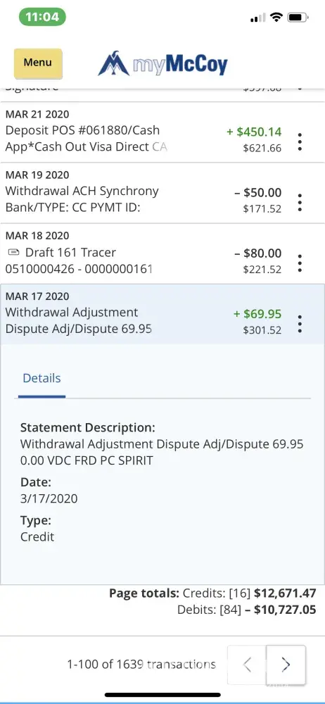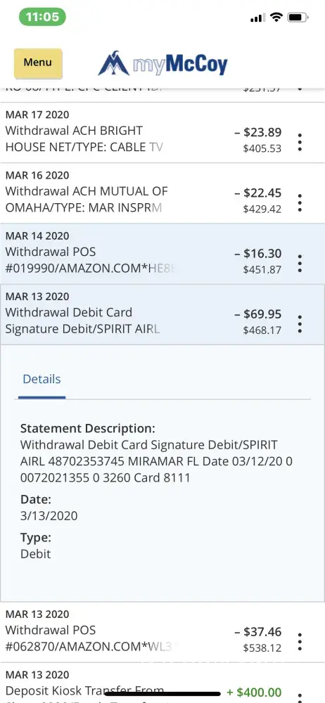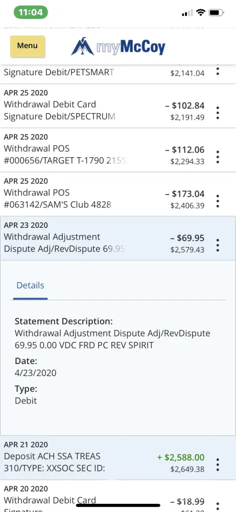 I was charged $69.95 on 3/20/20 by Spirit Airlines for an alleged Signature debut/SPIRIT AIR [protected] MIRAMAR FL Date 03/12/20 [protected] 0 3260 Card 8111. I never authorized or signed up for a Visa card or that alleged transaction from Spirit. As soon as I noticed the transaction, I reported my debit card number stolen to my bank McCoy Federal Credit Union and they refunded the money to my account and issued me a new debit card. They investigated the charge. Somehow Spirit disputed and my bank reversed my refund and I got stock with a $69.95 on a transaction that I never made or authorized at all. I need a refund of my money immediately. My email address is [protected]@yahoo.com.