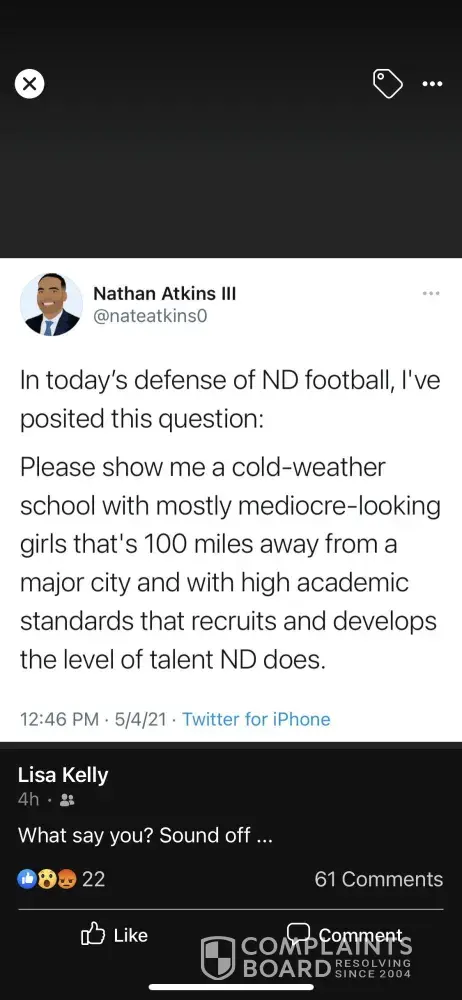 One of your writers, Nathan Atkins, is tweeting misogynistic and sexist remarks about the female students attending the University of Notre Dame. He actually characterized the physical appearance of the "girls" who attend Notre Dame as "mostly mediocre looking". He deleted the tweet after reading the hundreds of negative comments from readers on social media. He deleted the tweet without an apology.