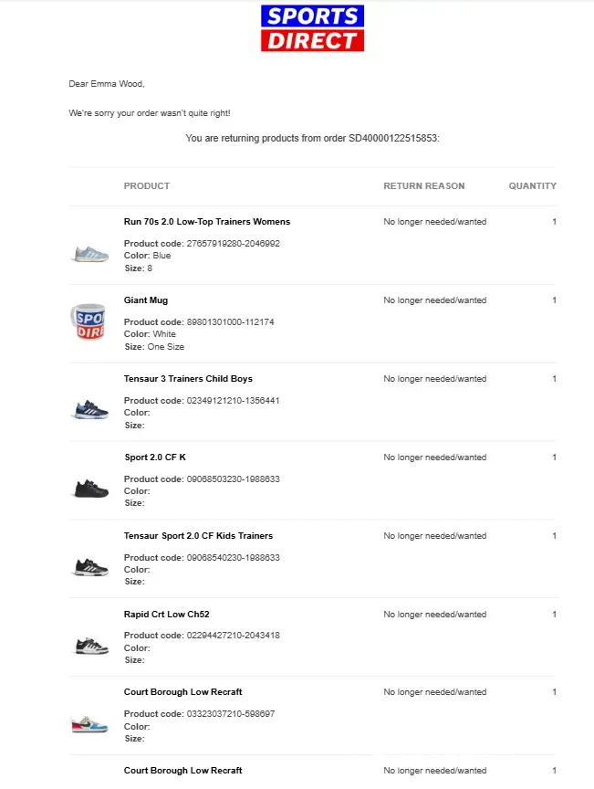 I went to my nearest store to try and get a replacement or refund, but the manager was not there and the staff told me that after 28 days from the date of purchase, I have no rights. This is incorrect and I was very disappointed. I decided to contact Sports Direct Customer Services via an online form and a member of the Customer Service team advised me to email photos of the faulty items and proof of purchase, which I did.