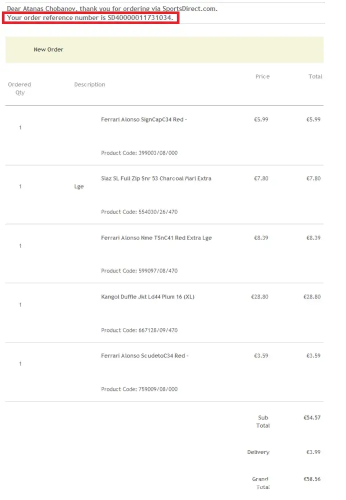 Two days after I have written about this problem to [protected]@SportsDirect.com (because I have never saw other method of contact with them) I noticed anoterh anomaly: The placed order (attachment_3.png) in status 'Awaiting Courier Pickup' seen in details now costs subtotal 62.56 EURO (attachment_4.png) as if I had chosen express delivery for 7.99 EURO. They have still not contacted me but I see a pathetic try to fix things up and make me bear the guilt.